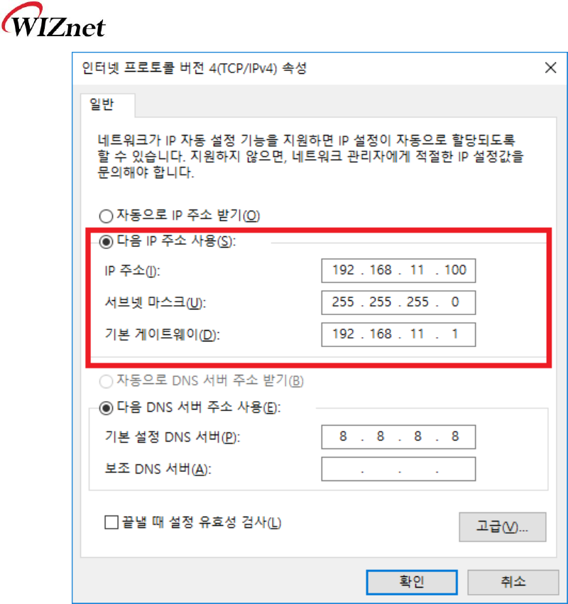 ② 아래 그림과 같이 IP를 설정하고 확인을 클릭하고 이전 창도 확인을 클릭한다.