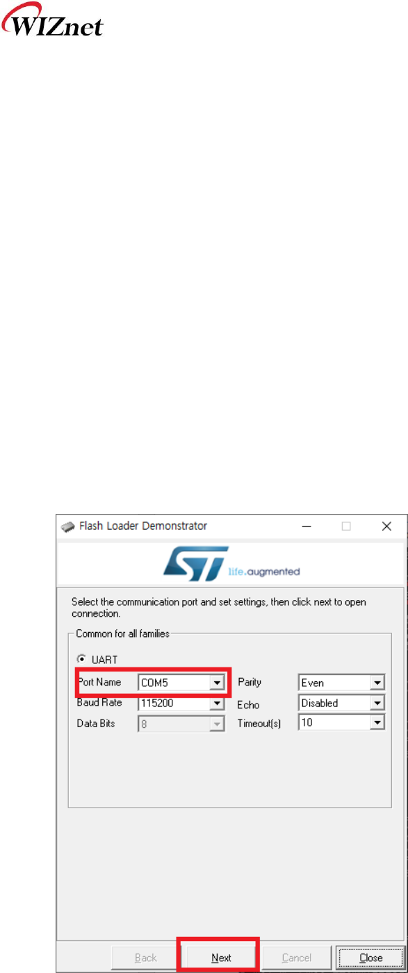 ③ EVB 가 인식된 Com 포트 번호로 설정 후 Next 버튼을 누른다.