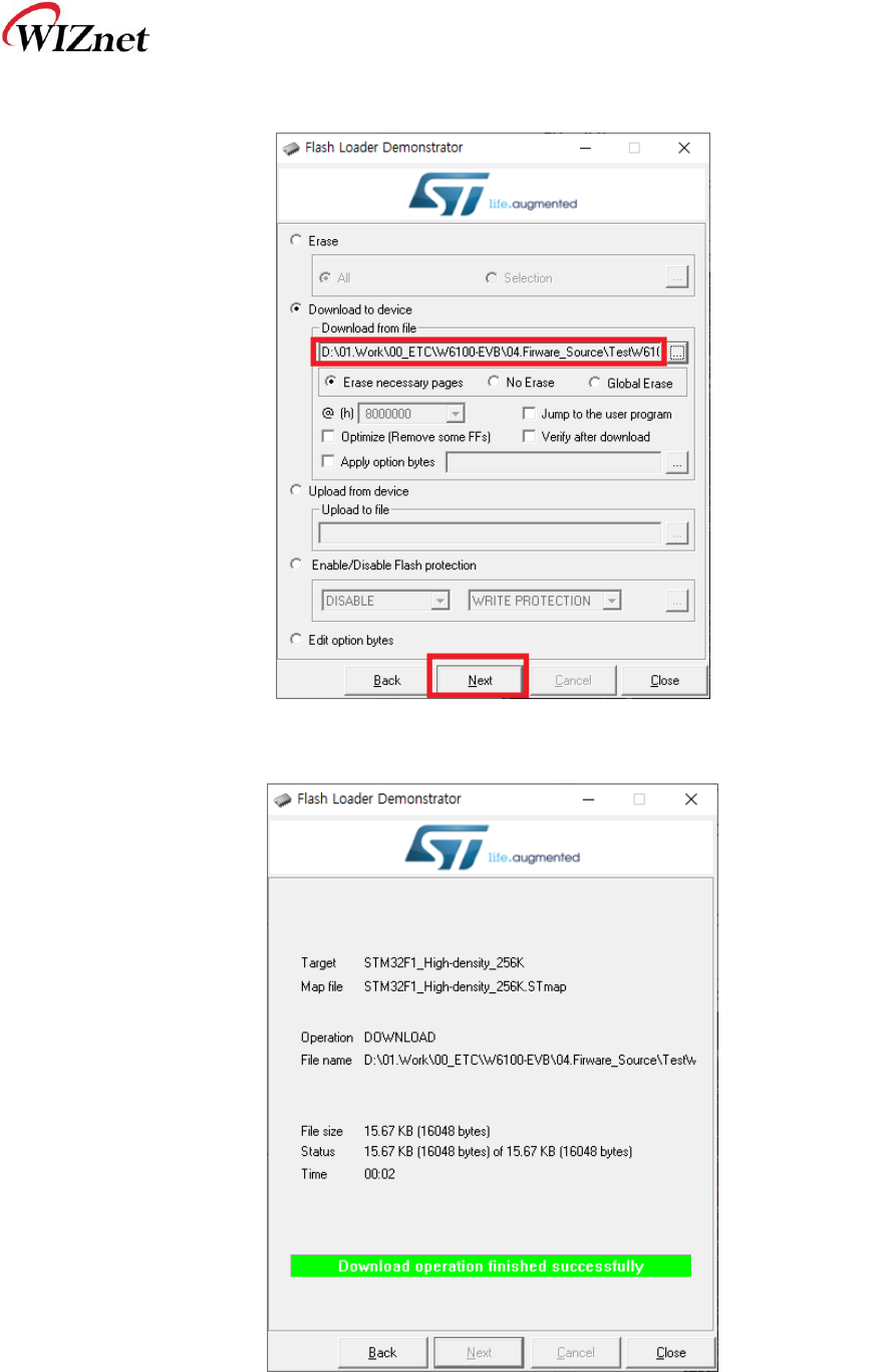 ⑥ 펌웨어를 선택하고 Next 버튼을 클릭하면 펌웨어 Writing이 완료된다.