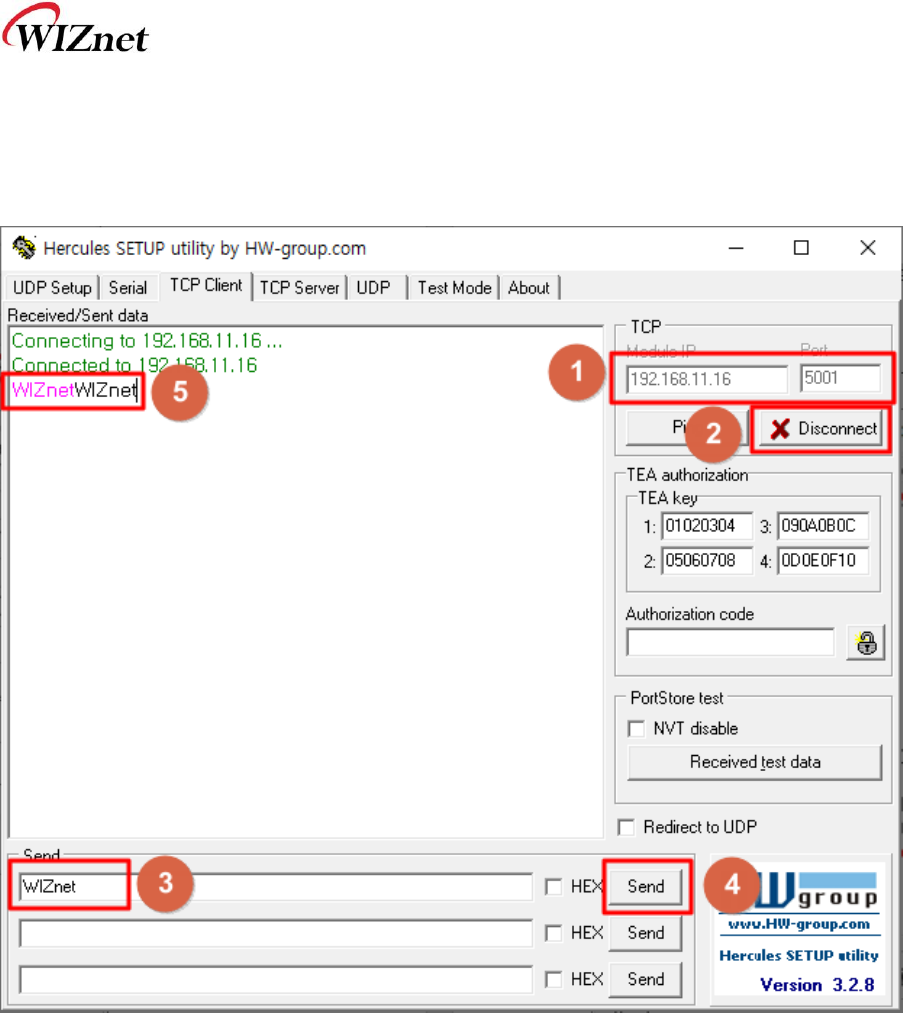 ④ TCP Client 탭을 선택 후 EVB의 IP에 접속 후, 메시지를 보내서, 보낸 메시지가 다시 수신