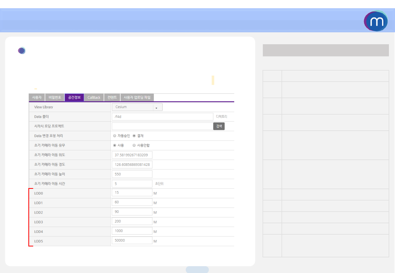 LOD(Level of Detail) 등의 공간정보 정책을 설정합니다 .번호 설명