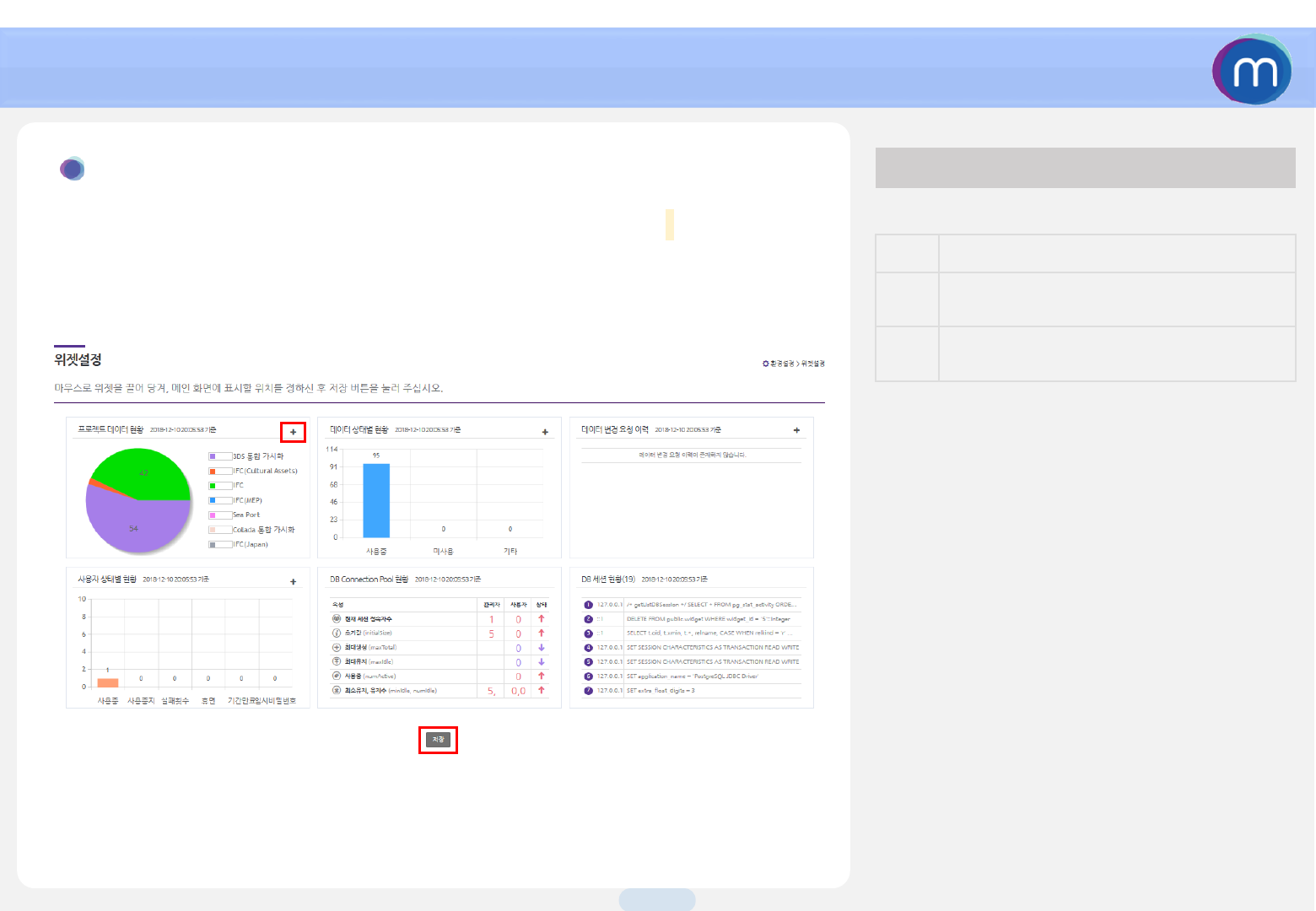•프로젝트별 데이터 현황, 데이터 상태별 현황, 데이터 변경 요청 이력, 사용자 상태별 현황, DB
