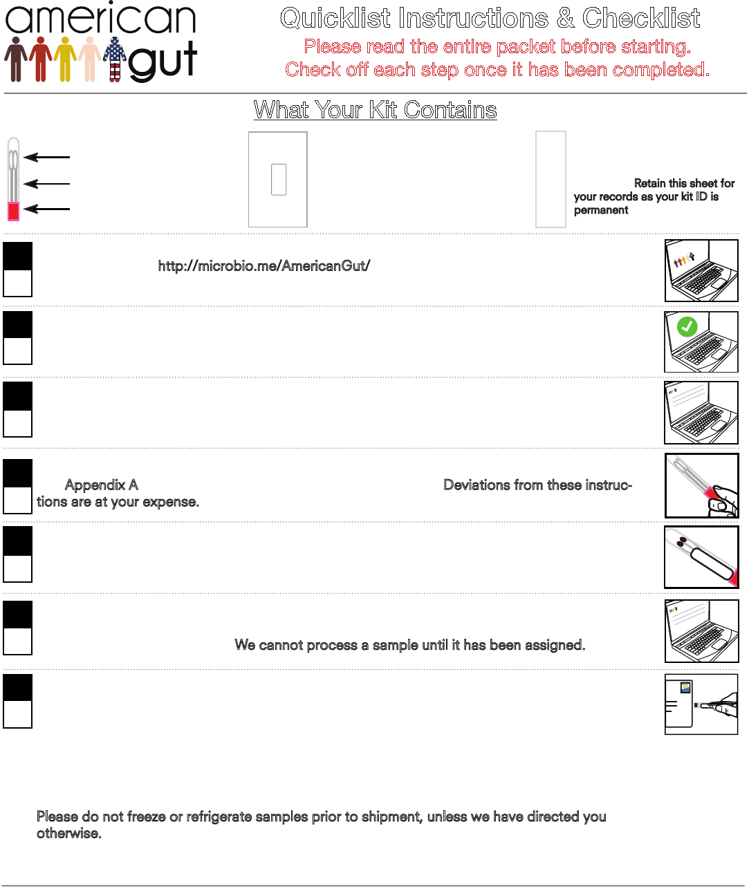 1. Registration: Register your kit at http://microbio.me/AmericanGut/ using the kit ID and password