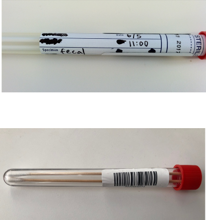 1. FECAL: Rub both cotton tips on a fecal specimen (ideally, a used piece of toilet paper). Collect a small
