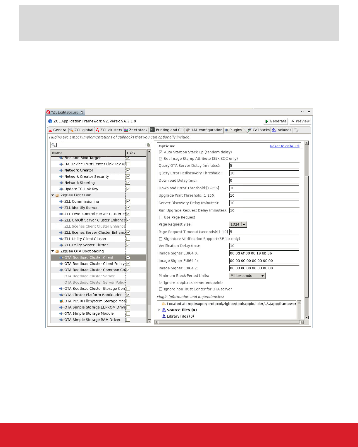 OTA client plugin. On the AppBuilder Plugins tab, select the OTA Bootload Cluster Client plugin. If the plugin is not enabled, on the ZCL