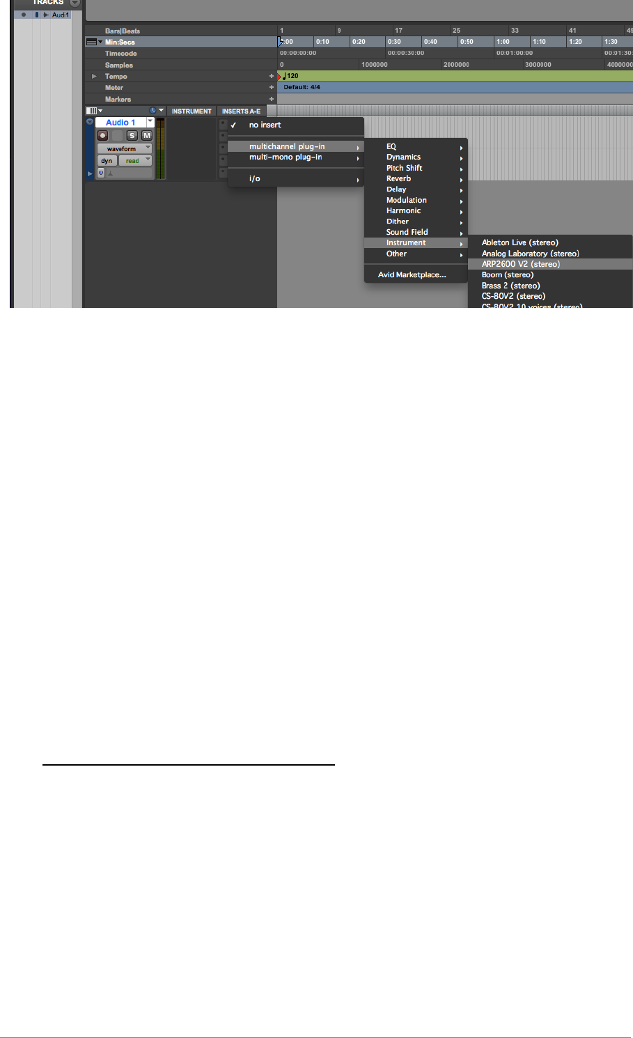 L’ARP2600 V doit être chargé sur une piste instrument stéréo. Nous pouvons