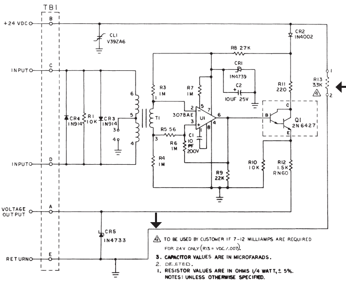The power for the operational amplifier is controlled by CR1, a zener diode, and