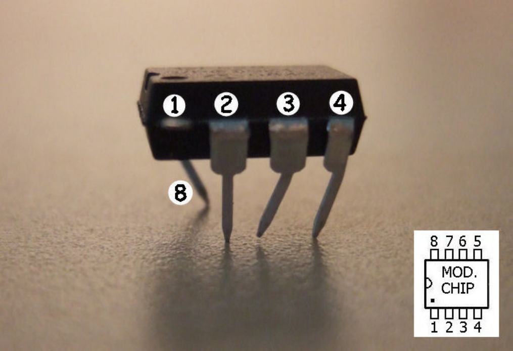 the mod. chip and then #3, #4 and #8 as shown below. Trim pins #1 and #5 and