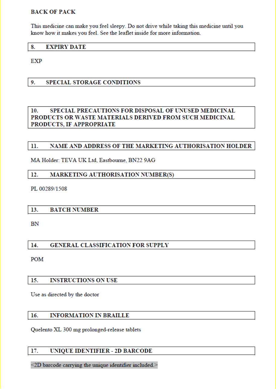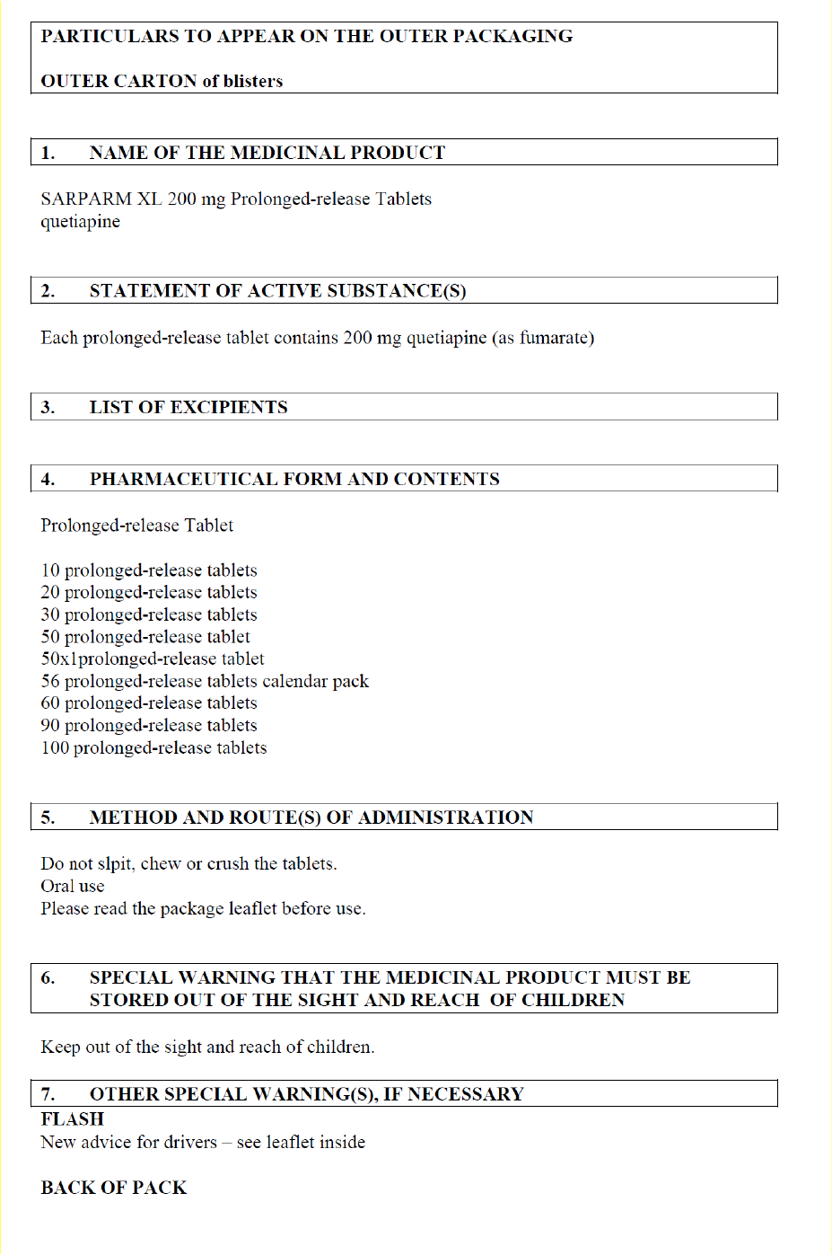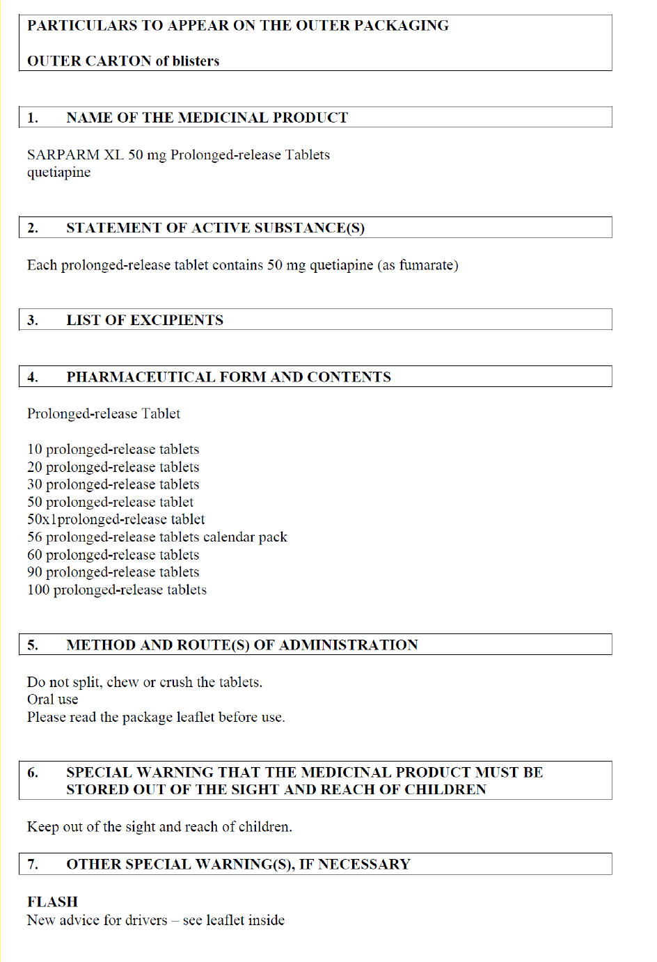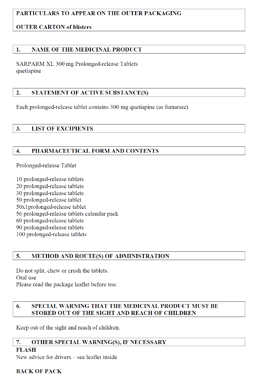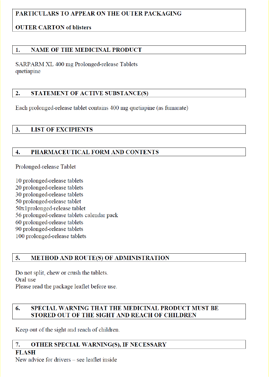 The current approved UK labelling Quelento/Sarparm XL 50, 200, 300 and 400 mg