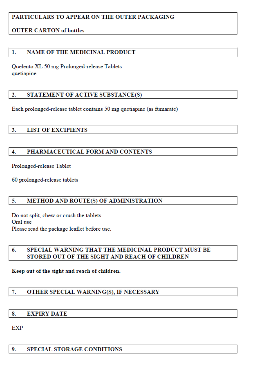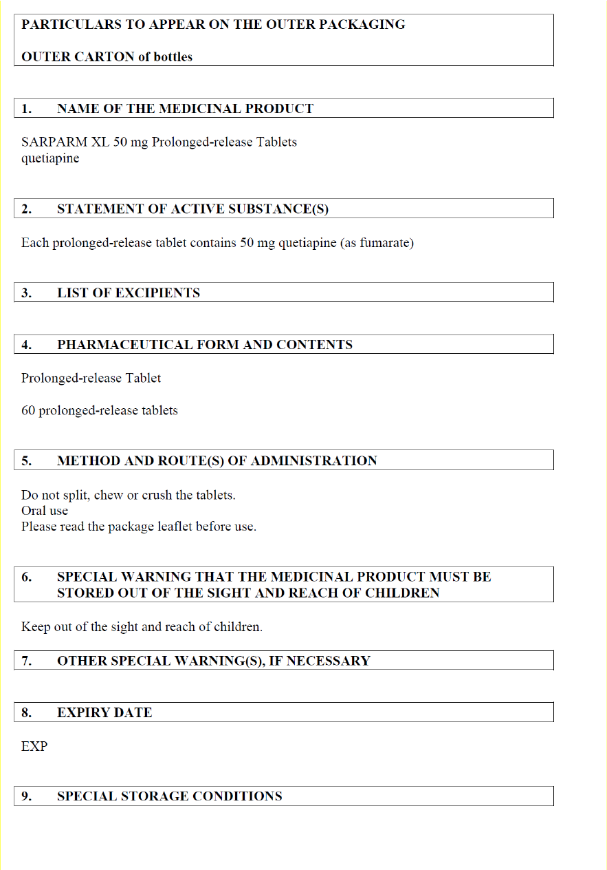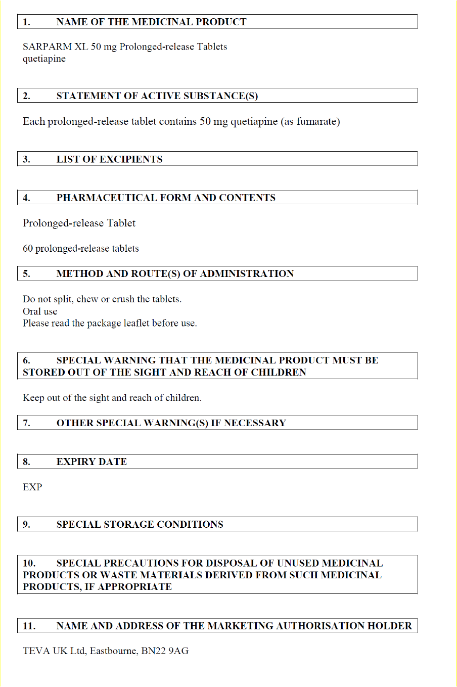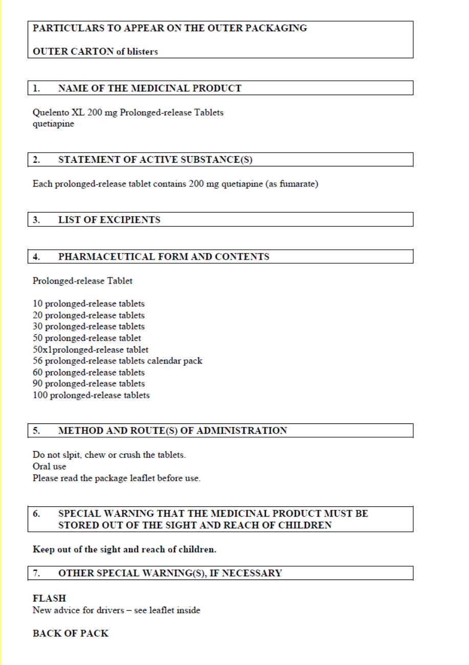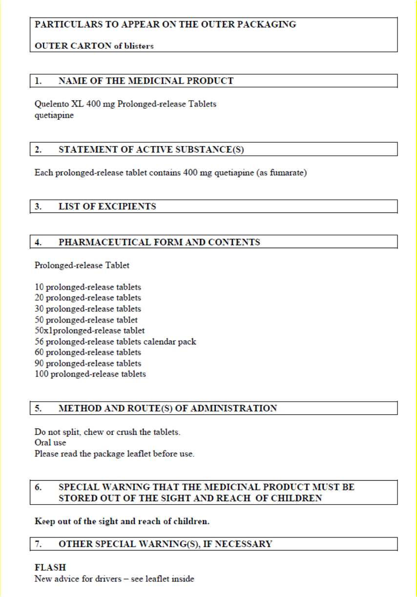 The current approved UK labelling Quelento/Sarparm XL 50, 200, 300 and 400 mg