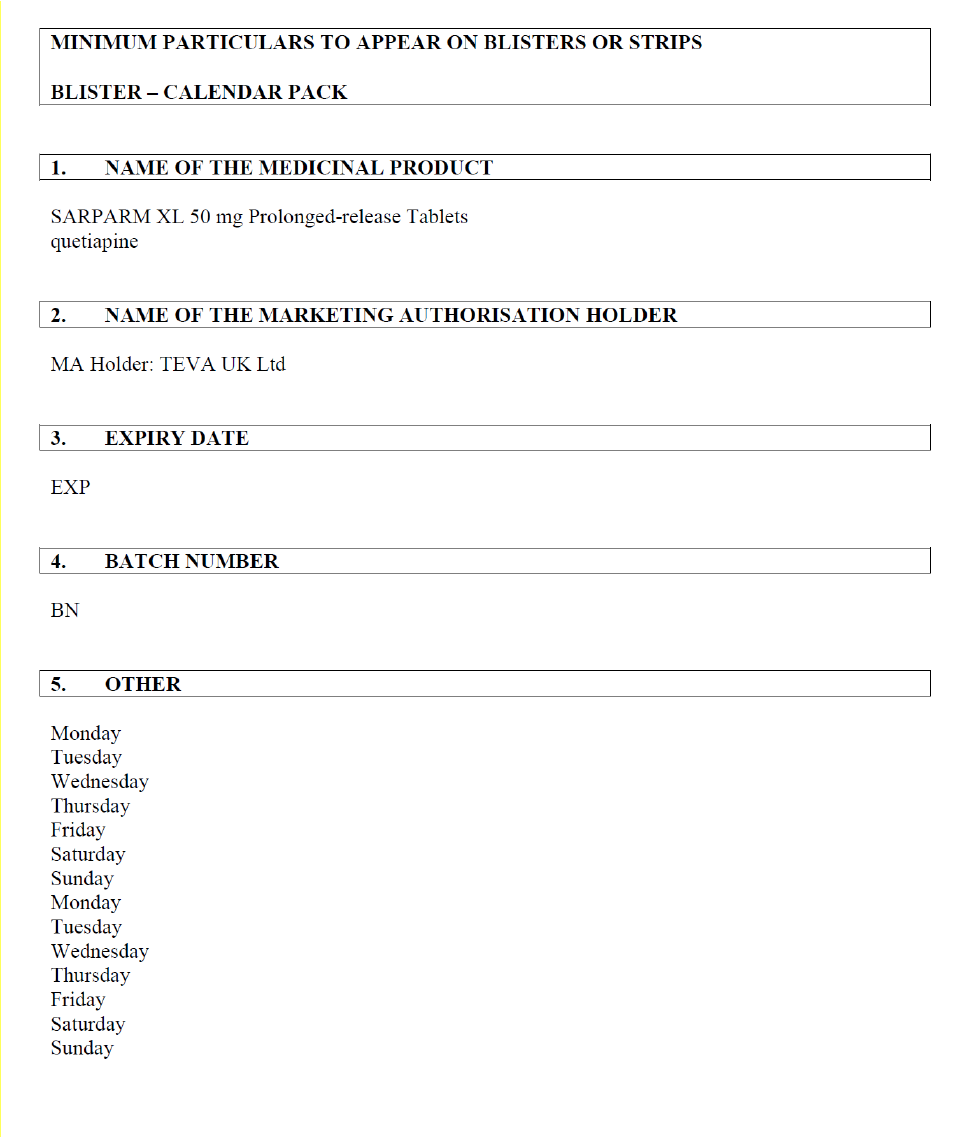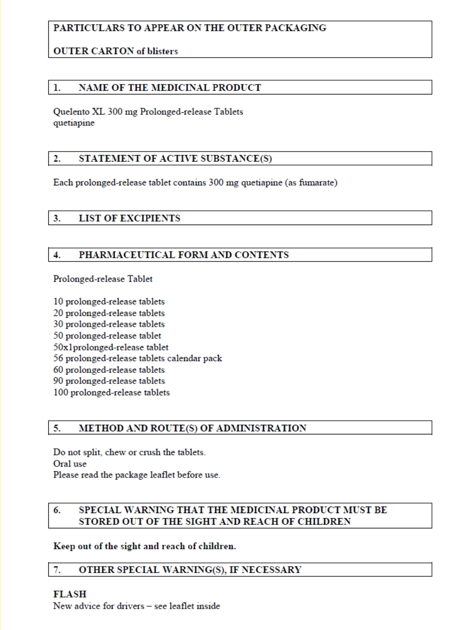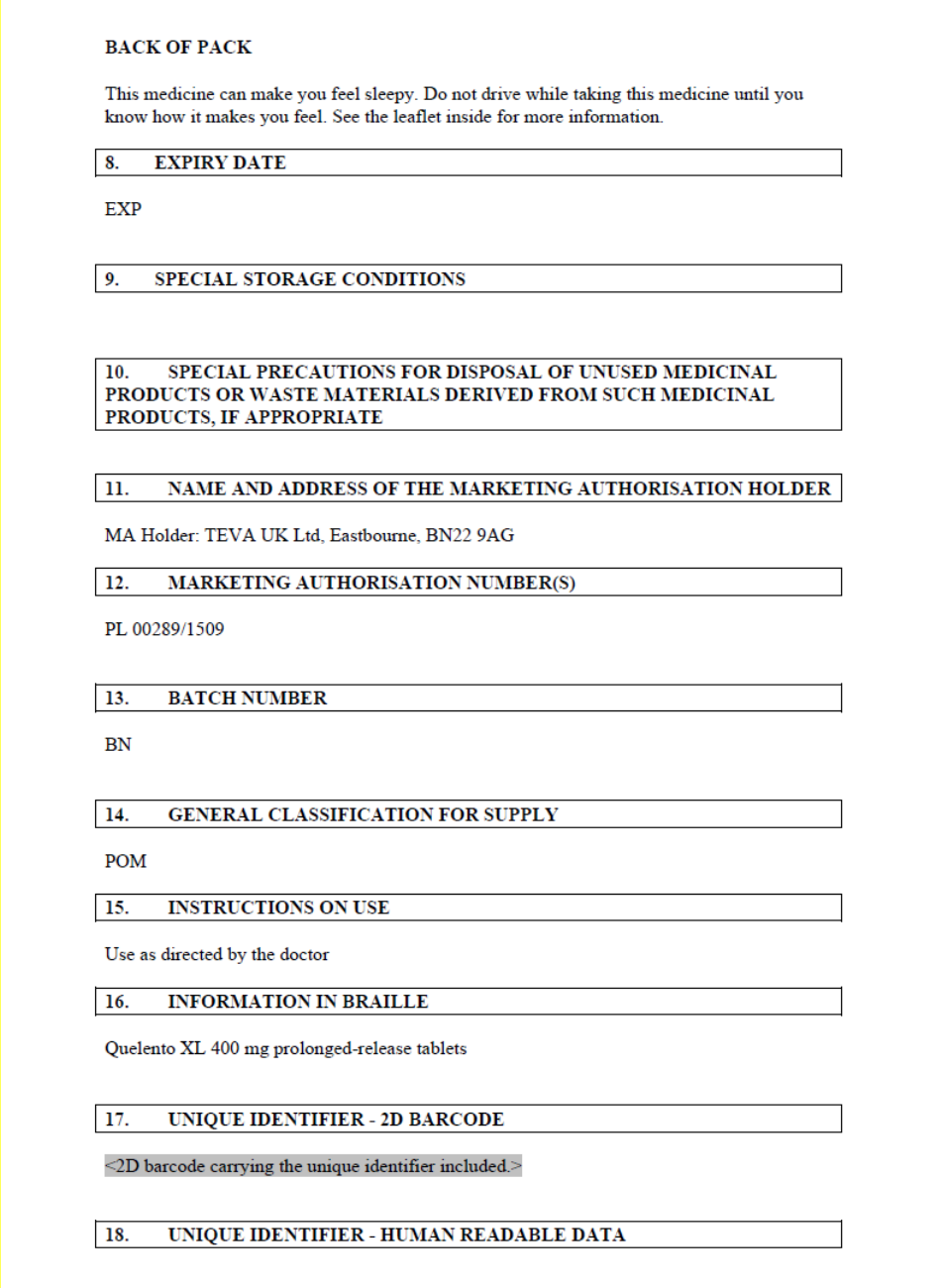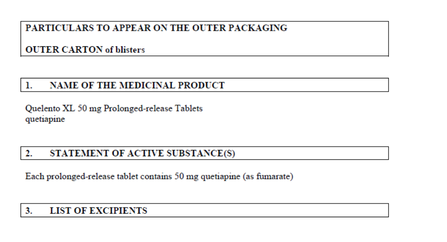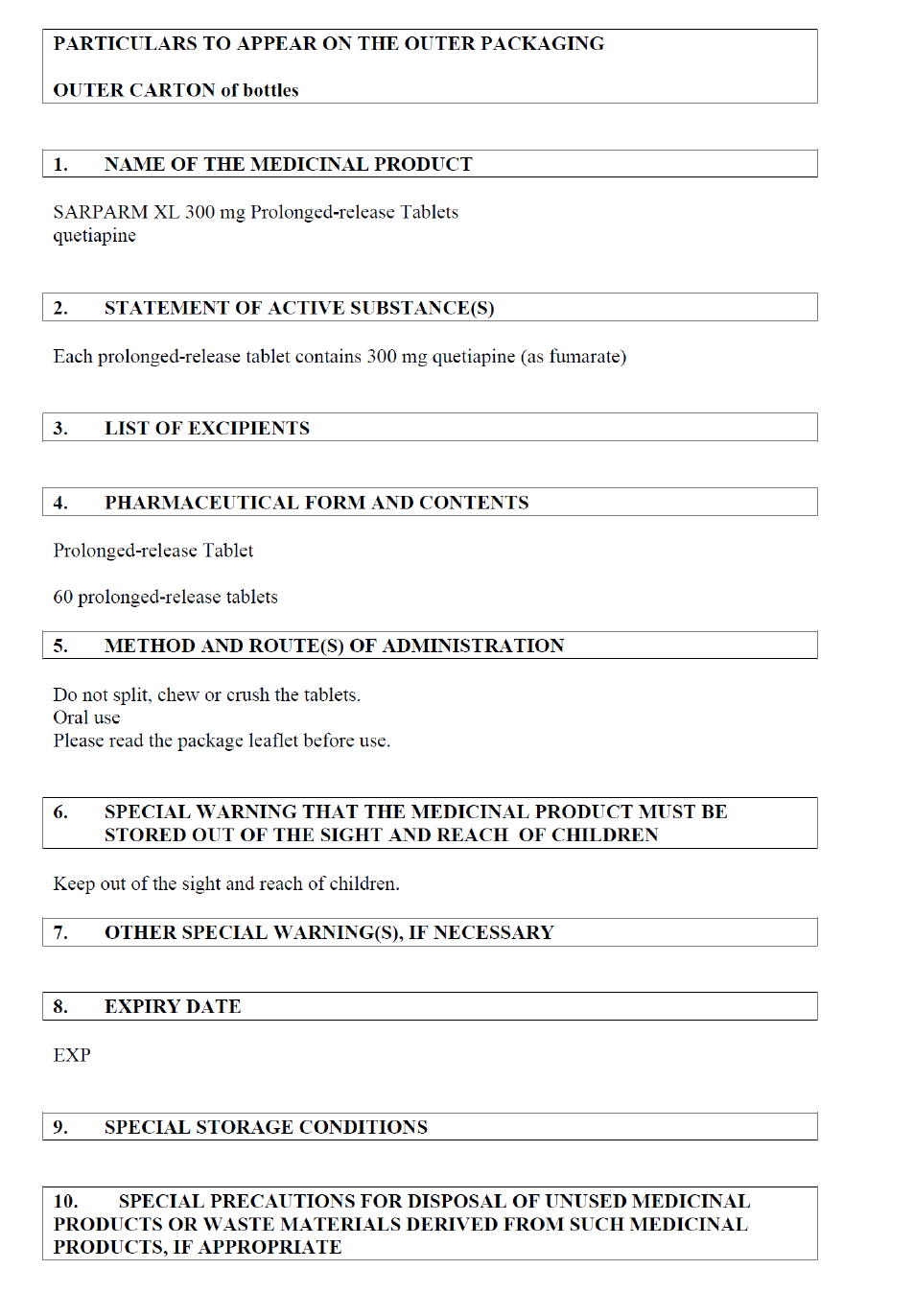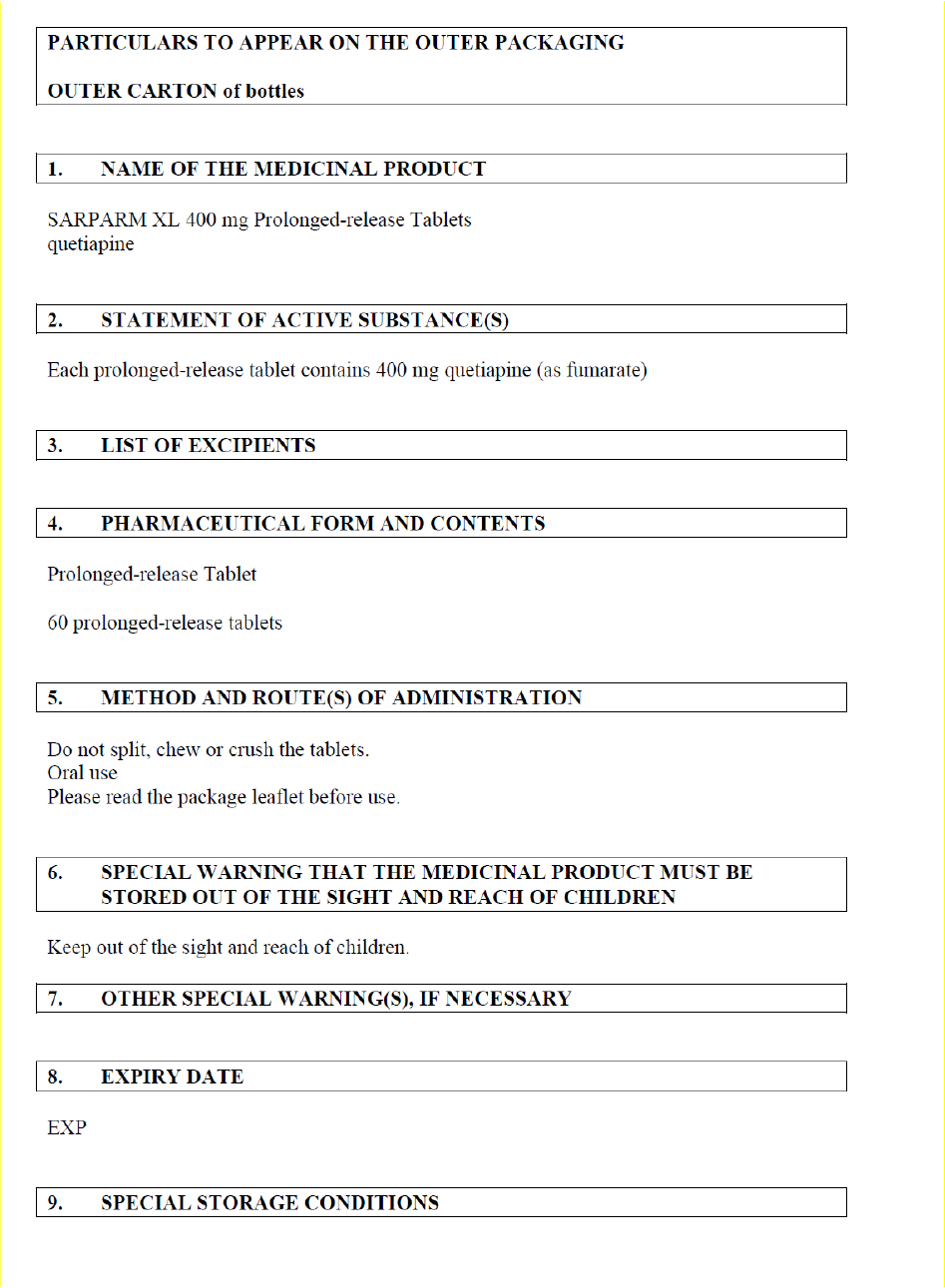 The current approved UK labelling Quelento/Sarparm XL 50, 200, 300 and 400 mg