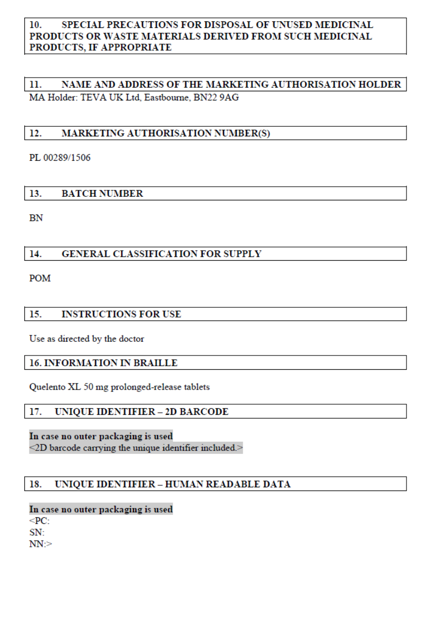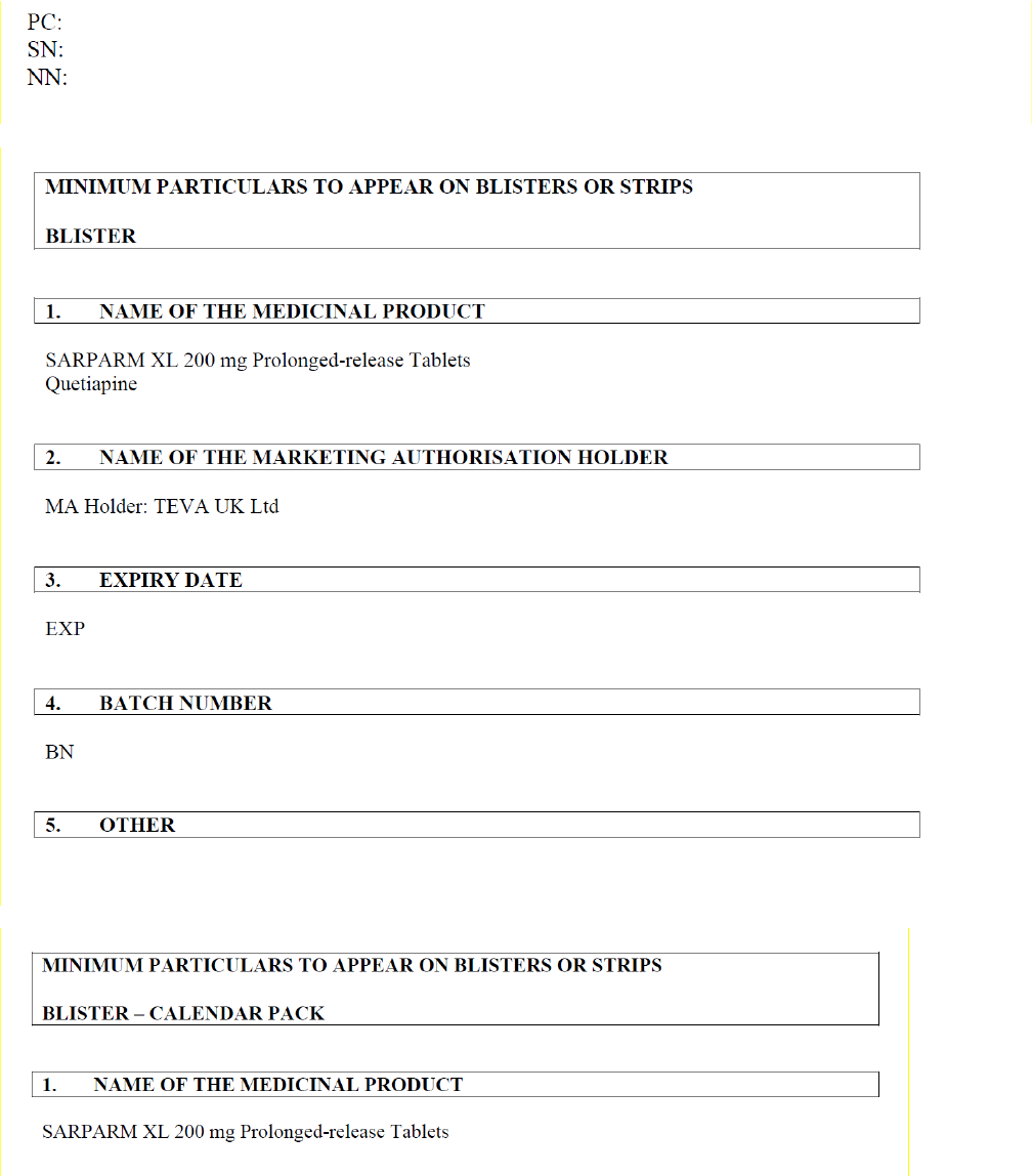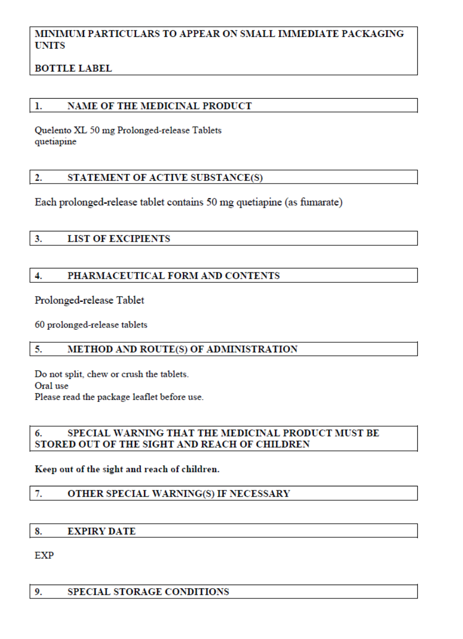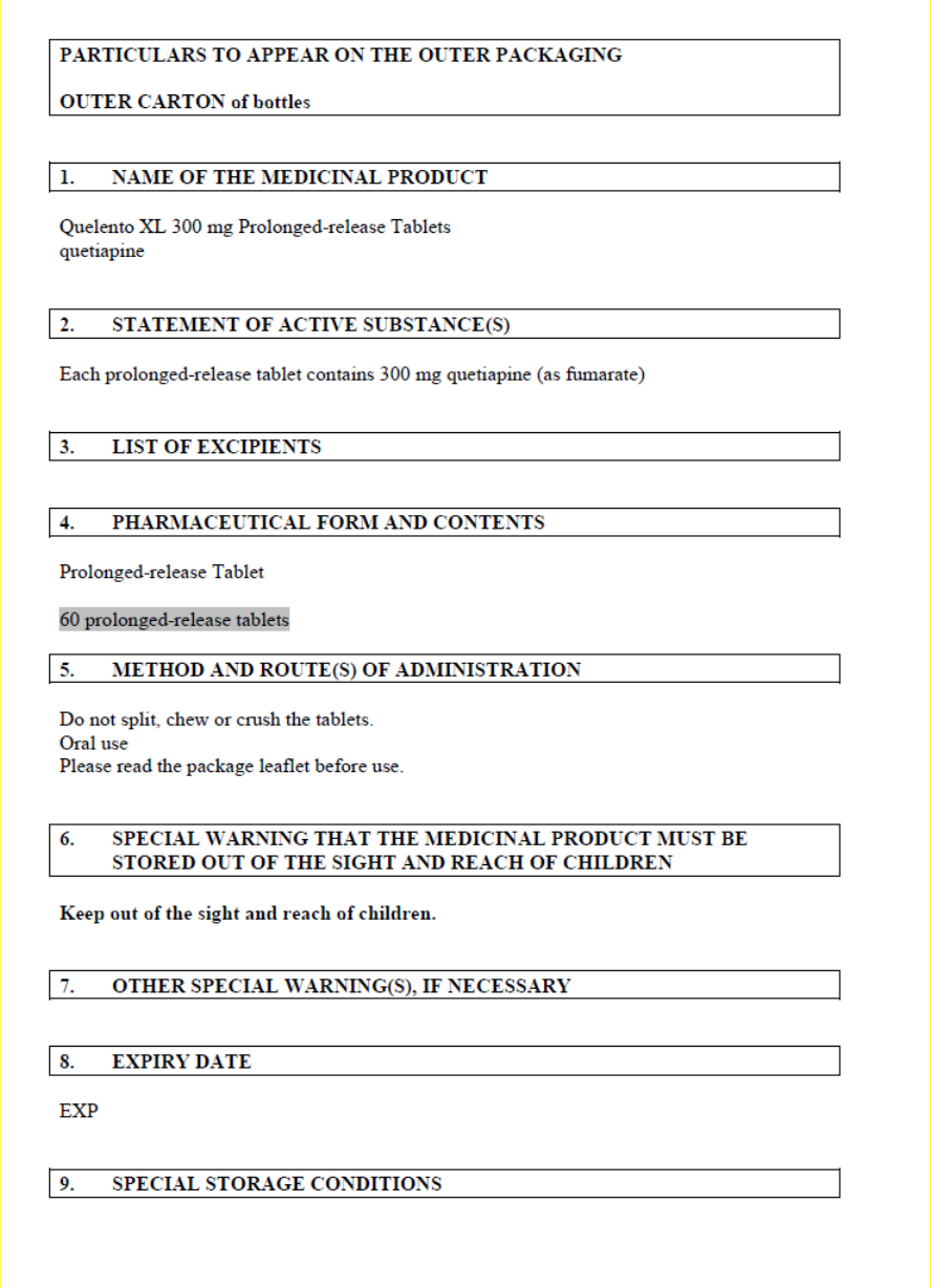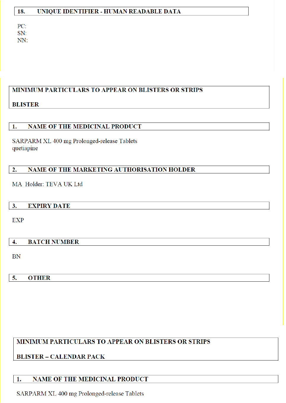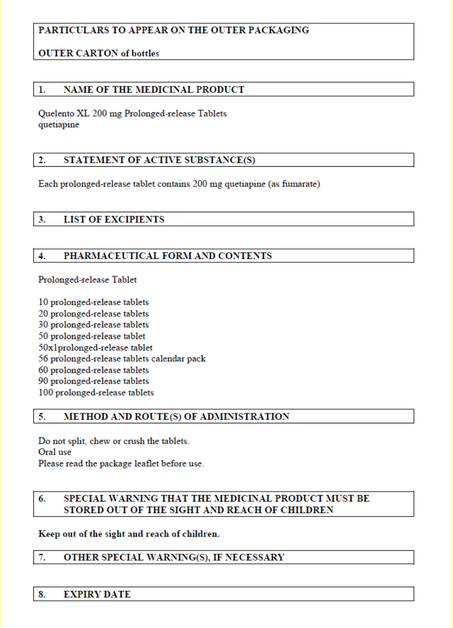 The current approved UK labelling Quelento/Sarparm XL 50, 200, 300 and 400 mg