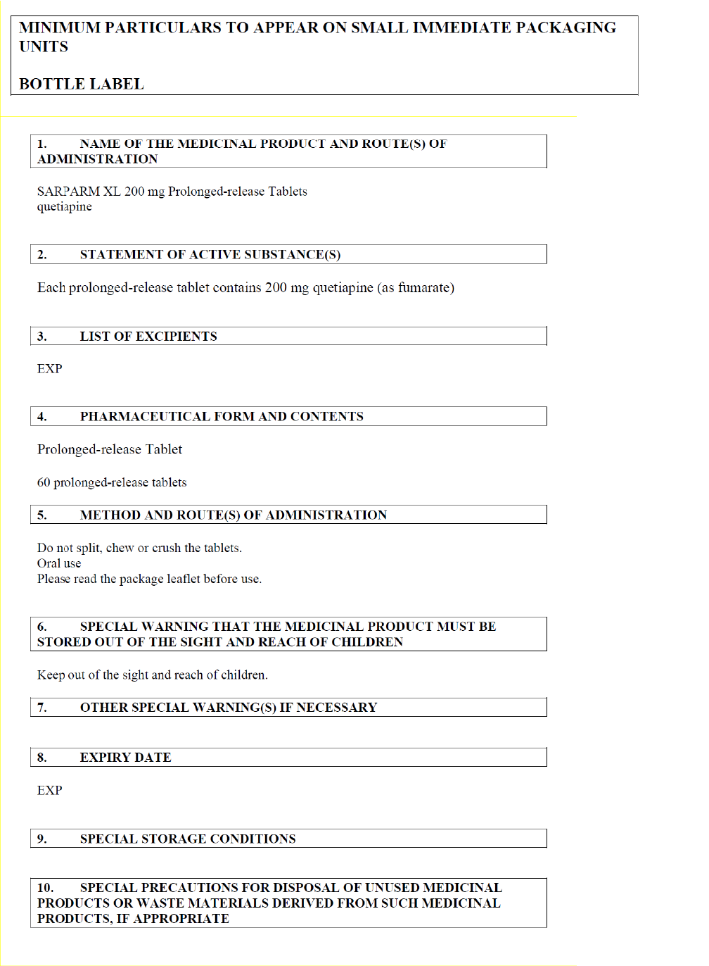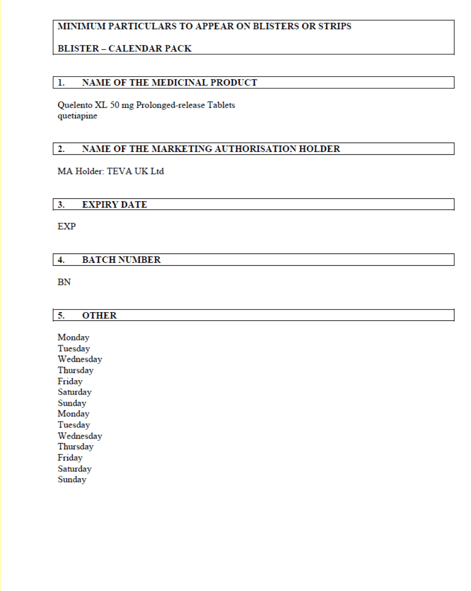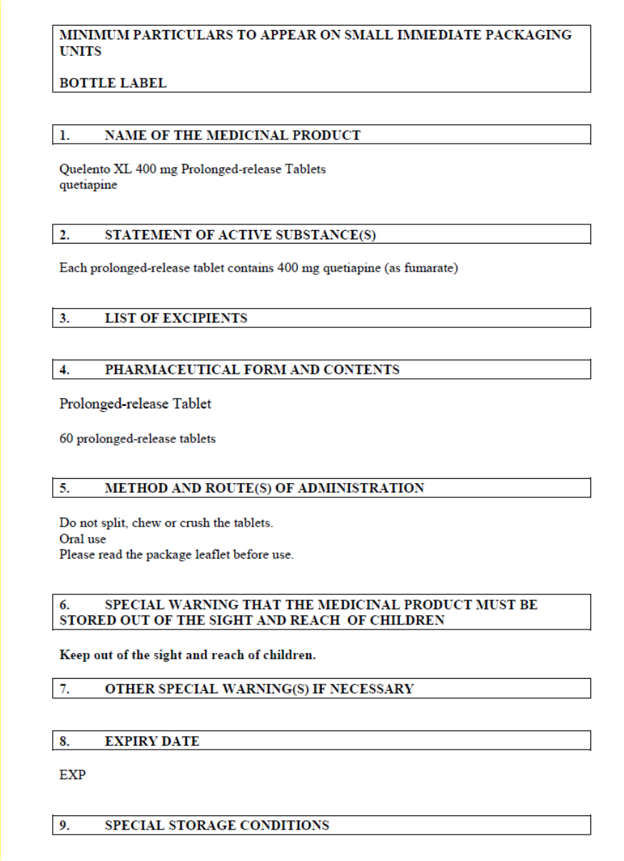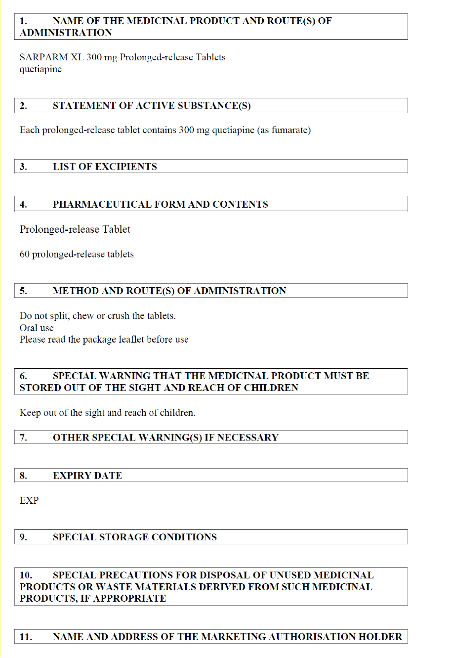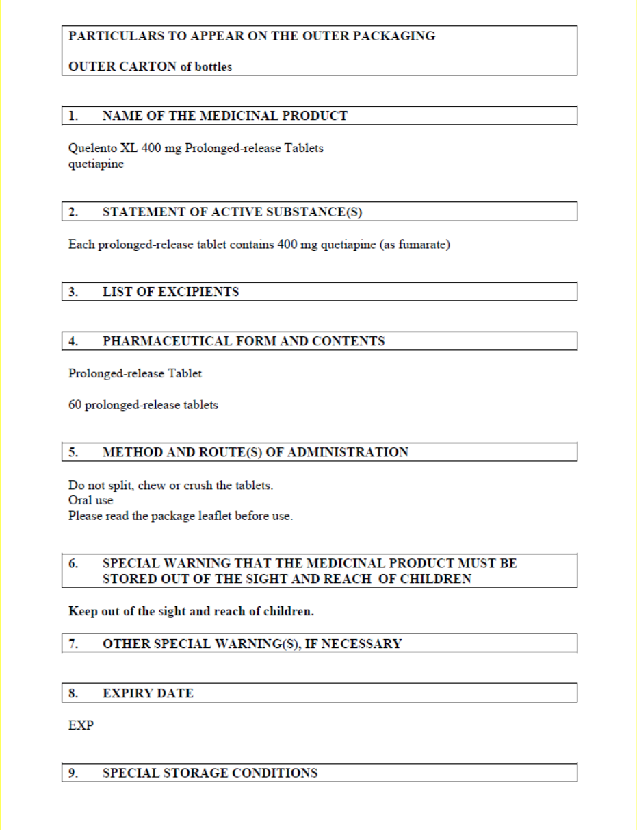The current approved UK labelling Quelento/Sarparm XL 50, 200, 300 and 400 mg