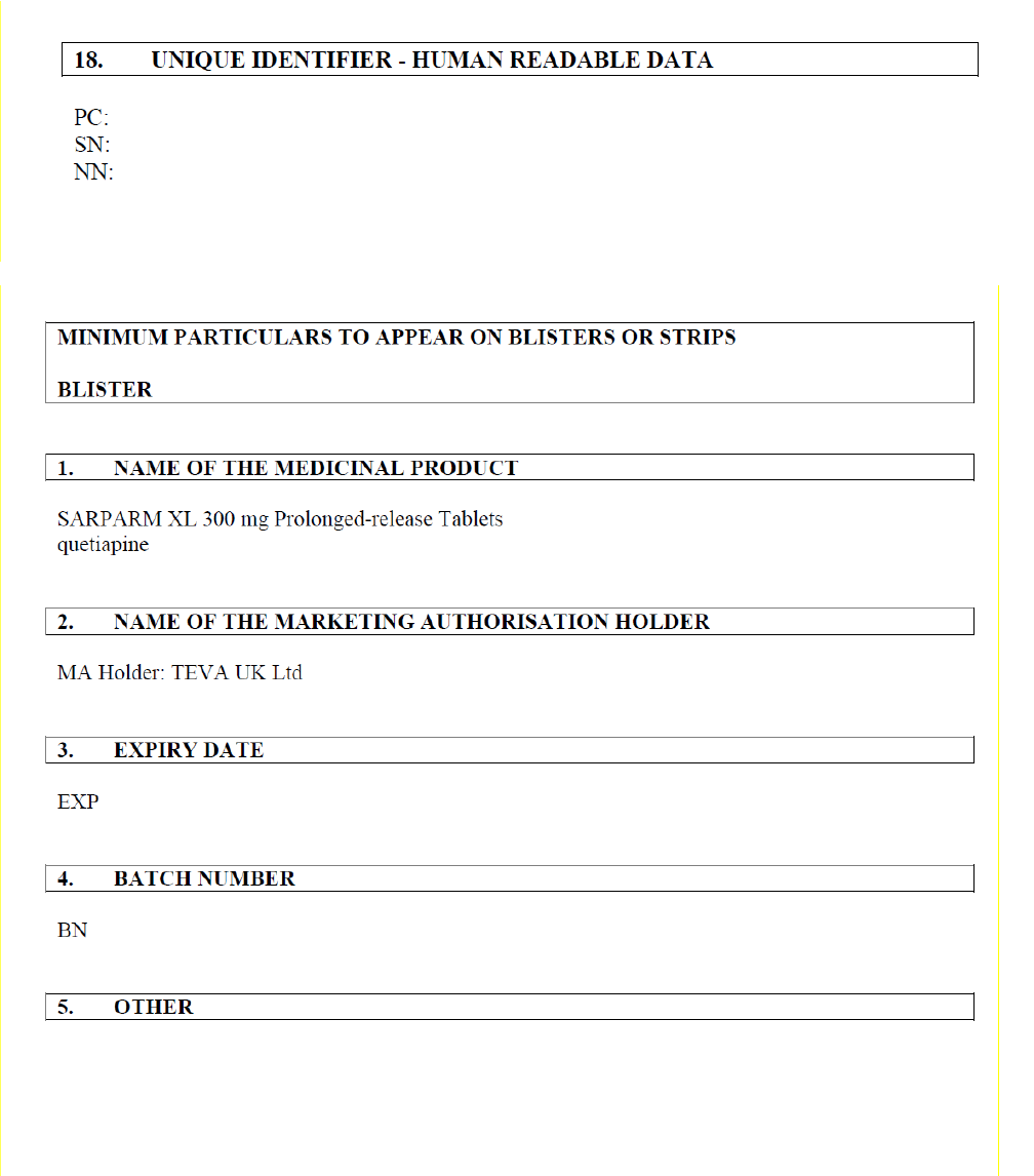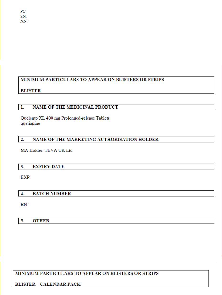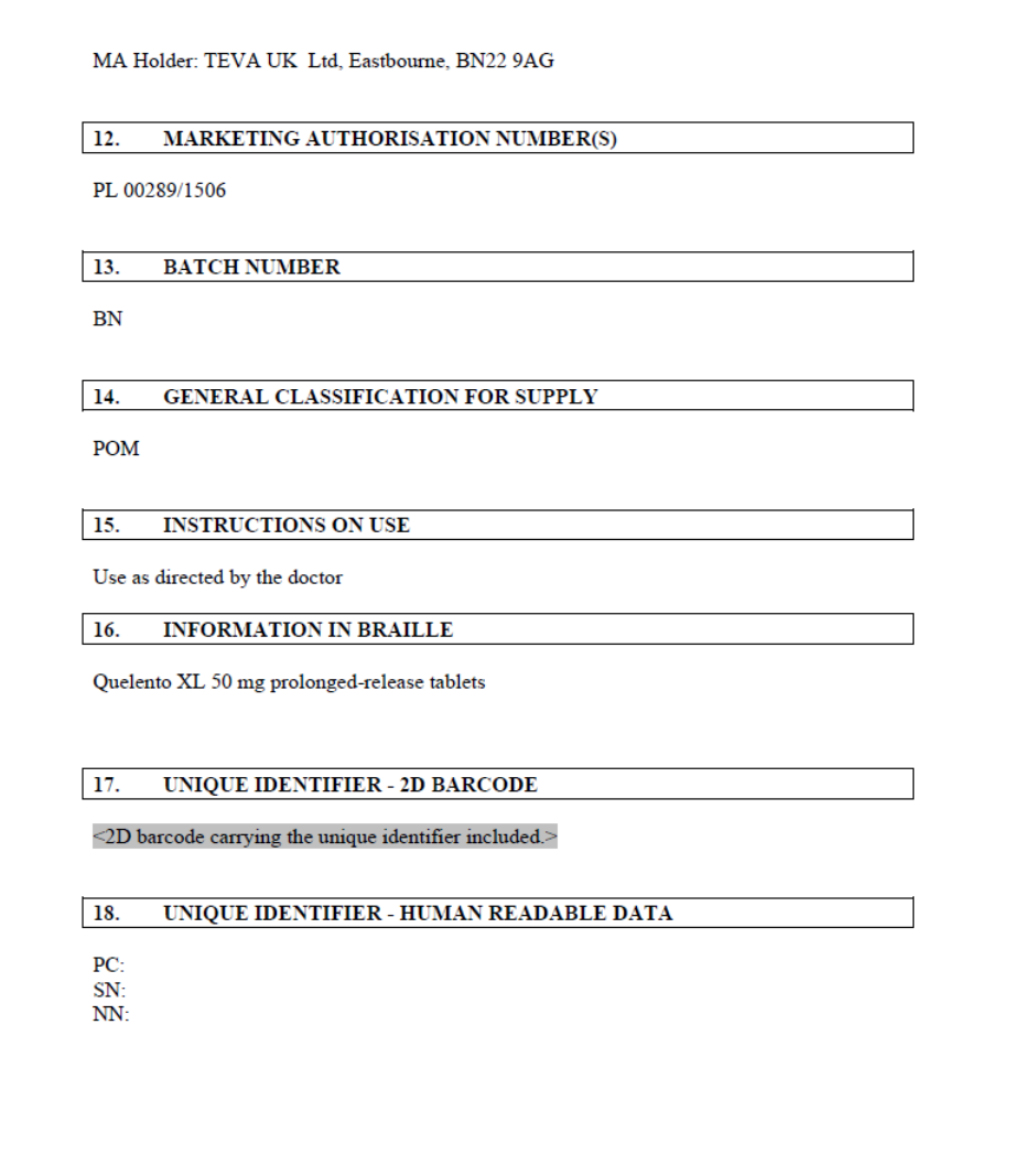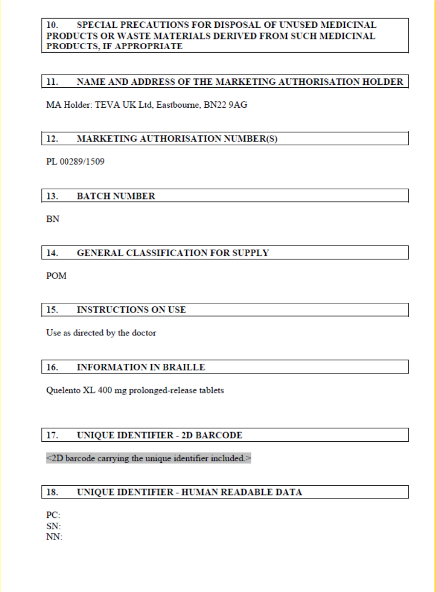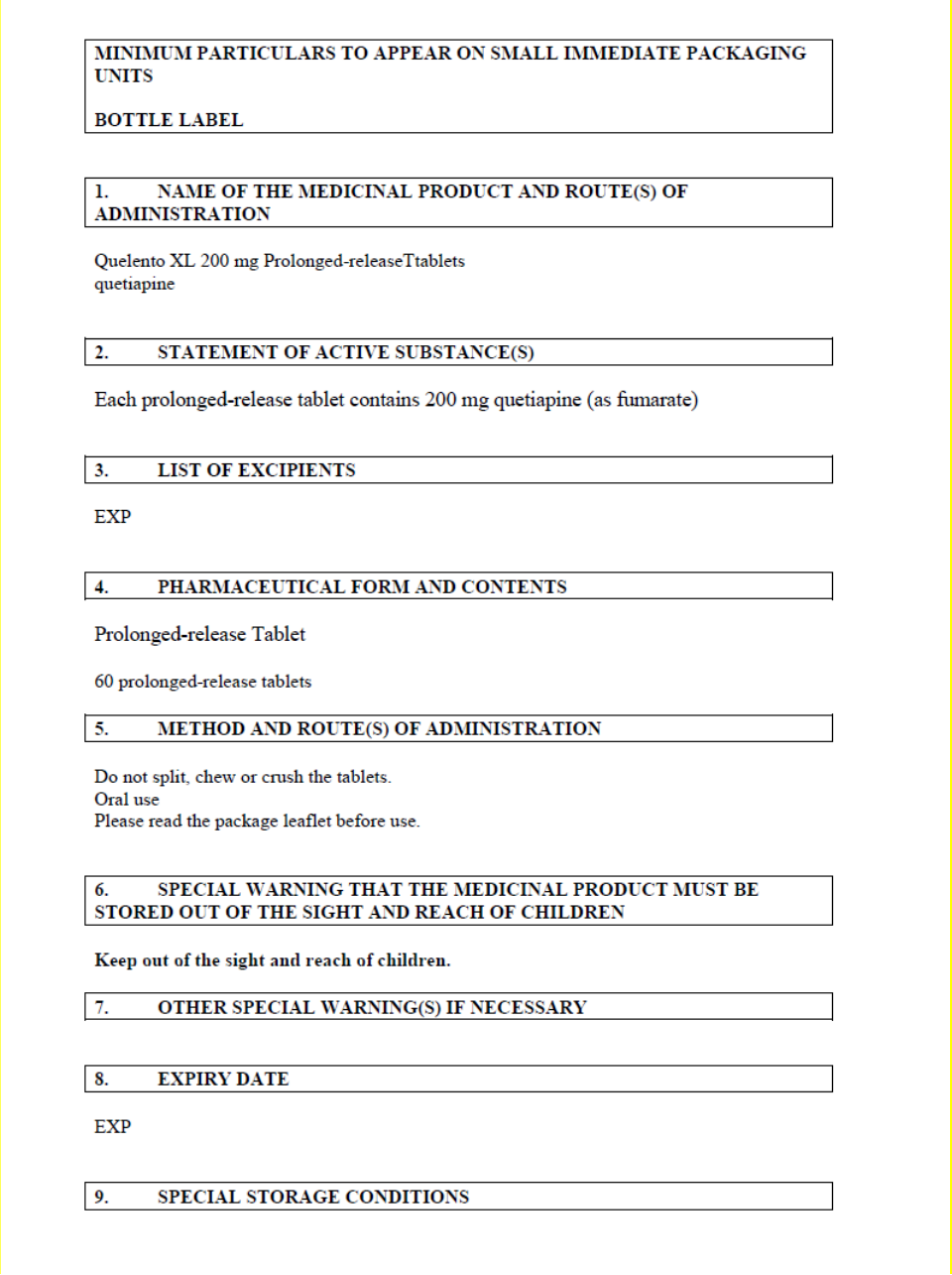 The current approved UK labelling Quelento/Sarparm XL 50, 200, 300 and 400 mg