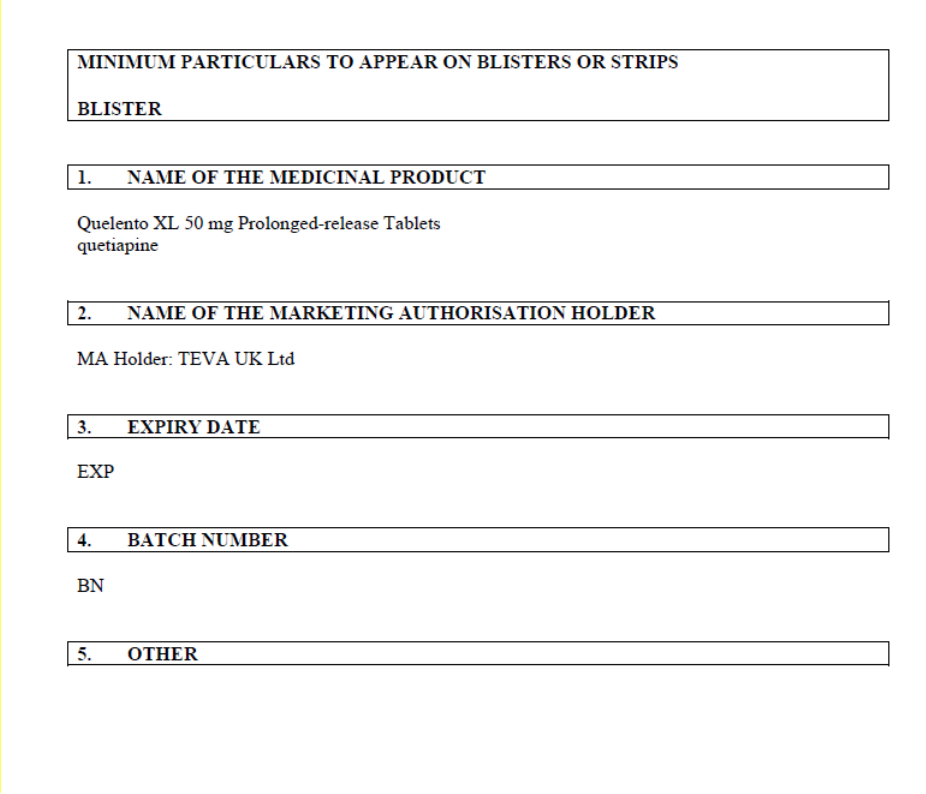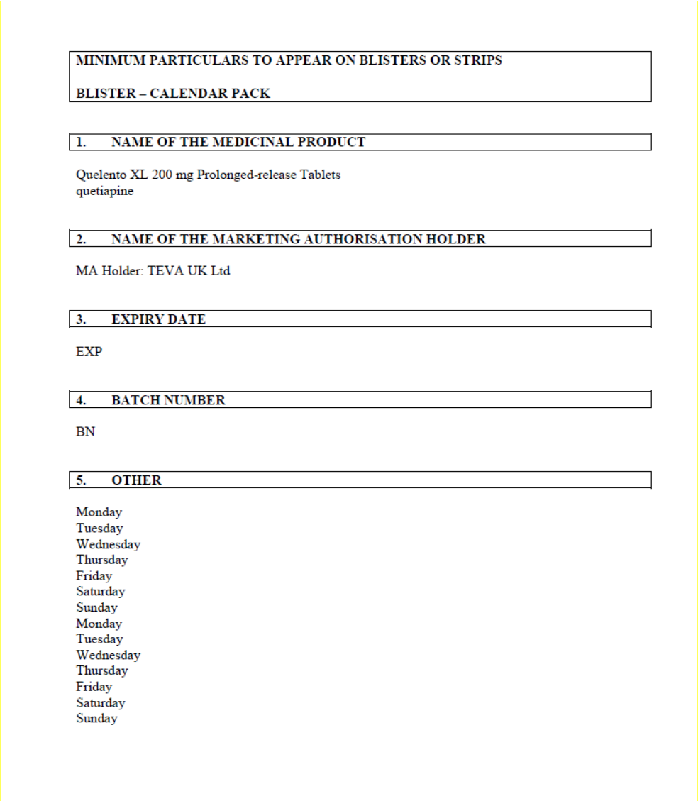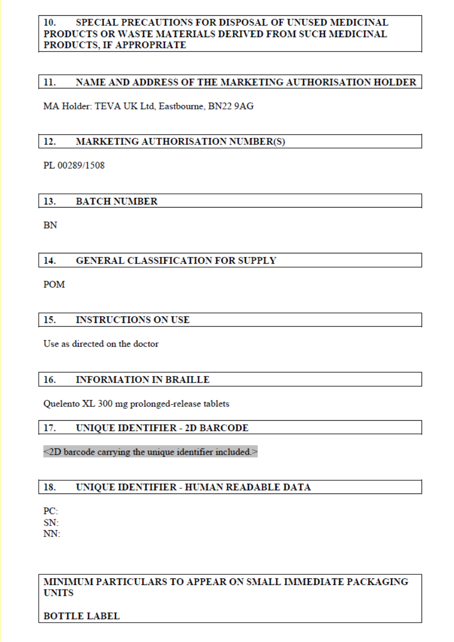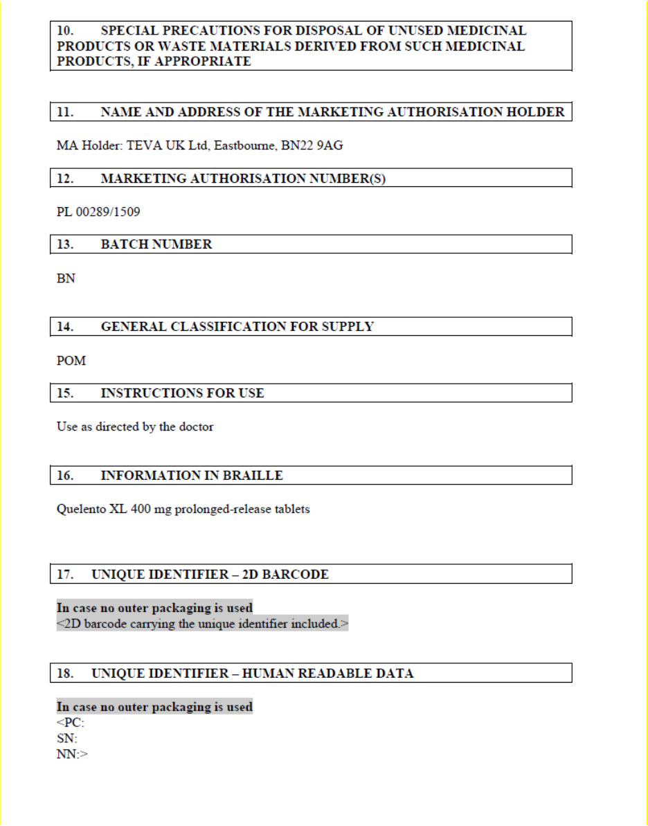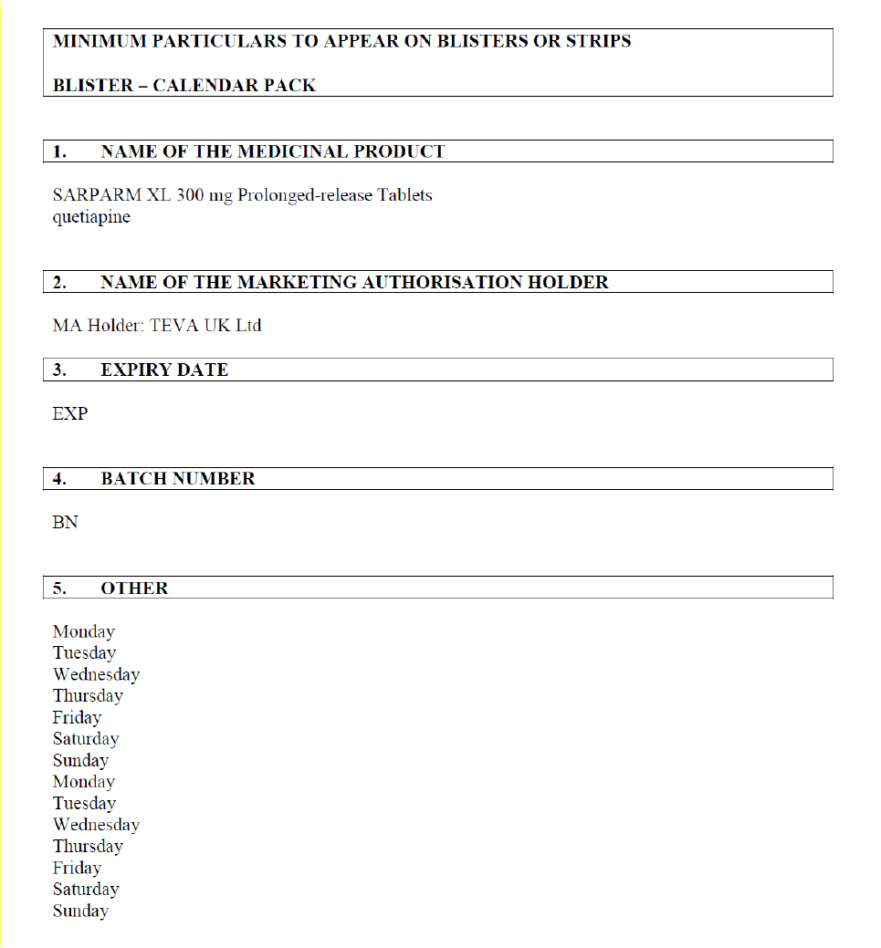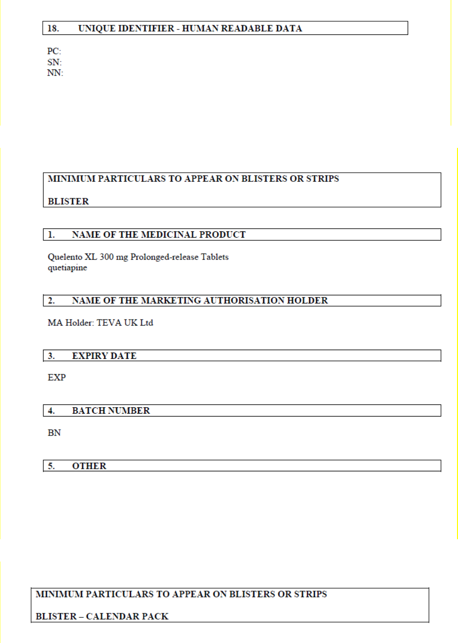 The current approved UK labelling Quelento/Sarparm XL 50, 200, 300 and 400 mg