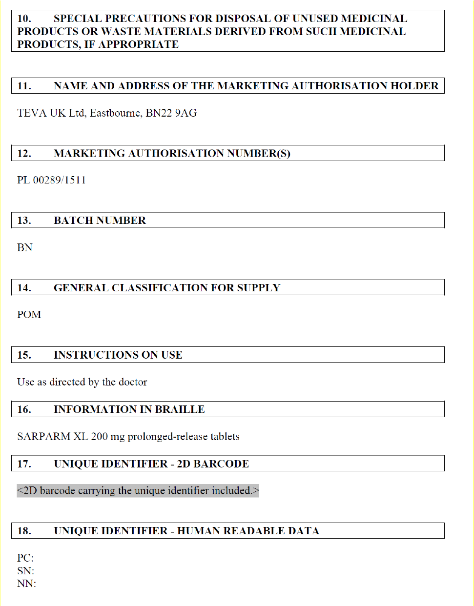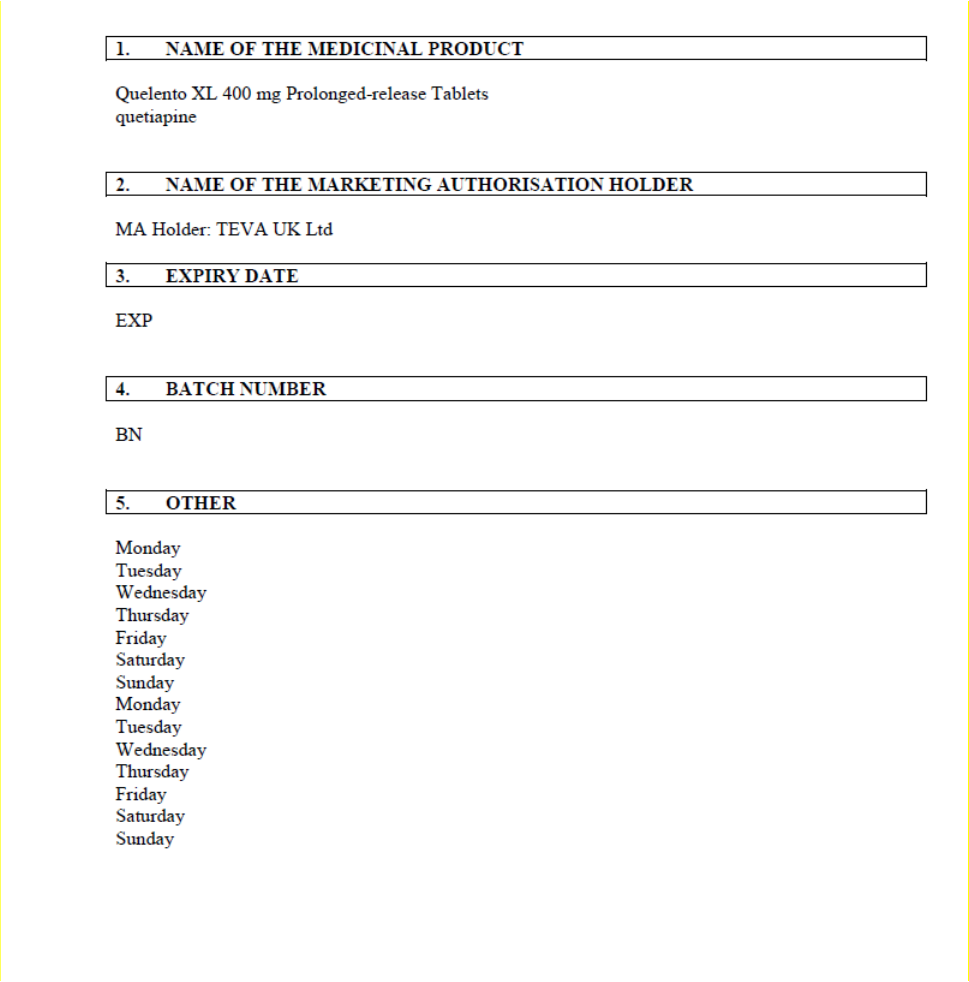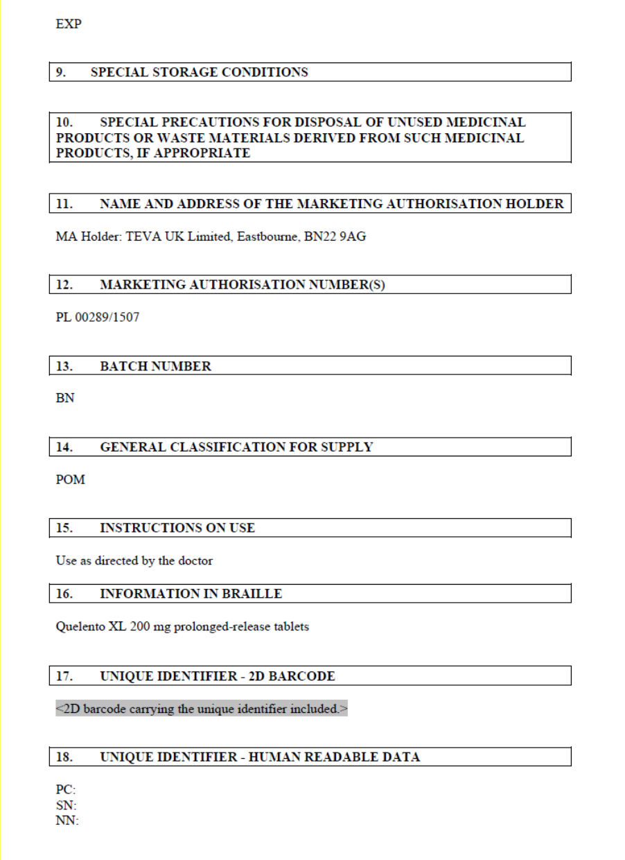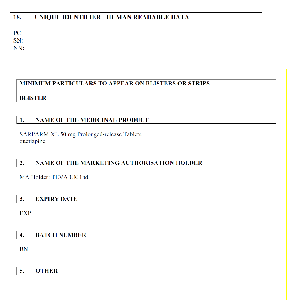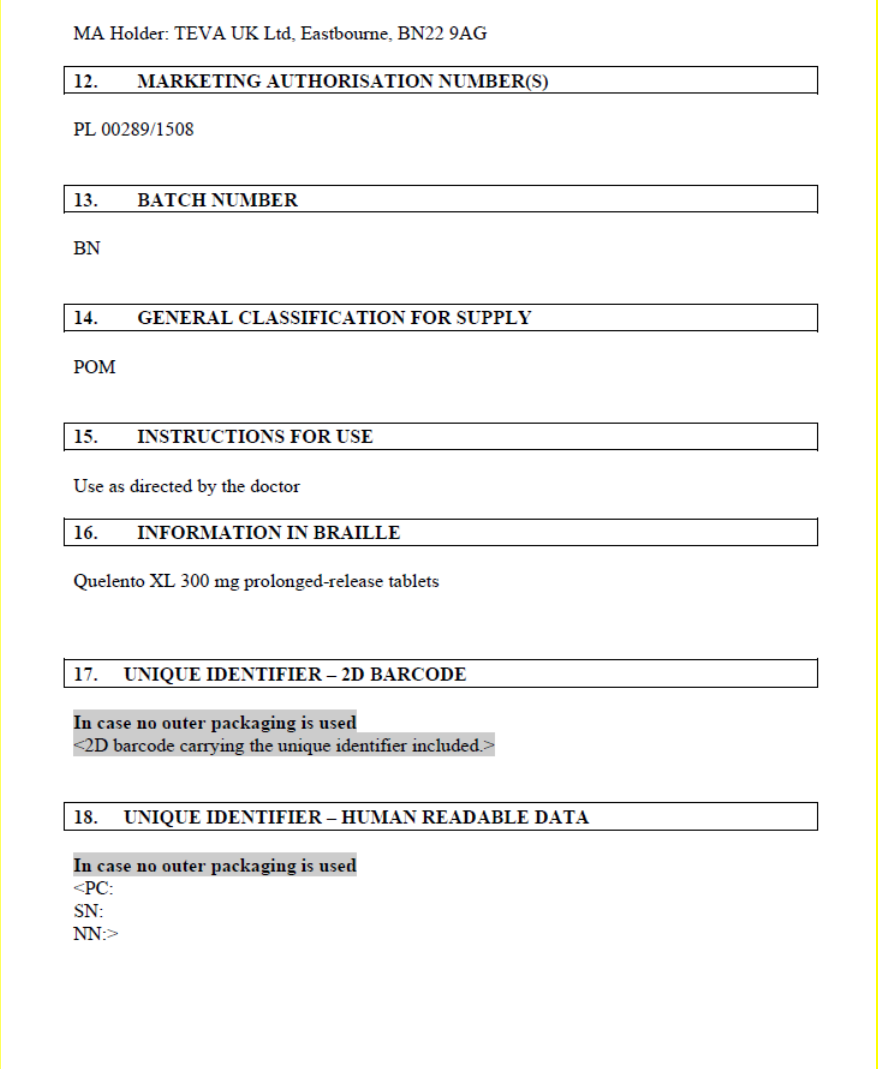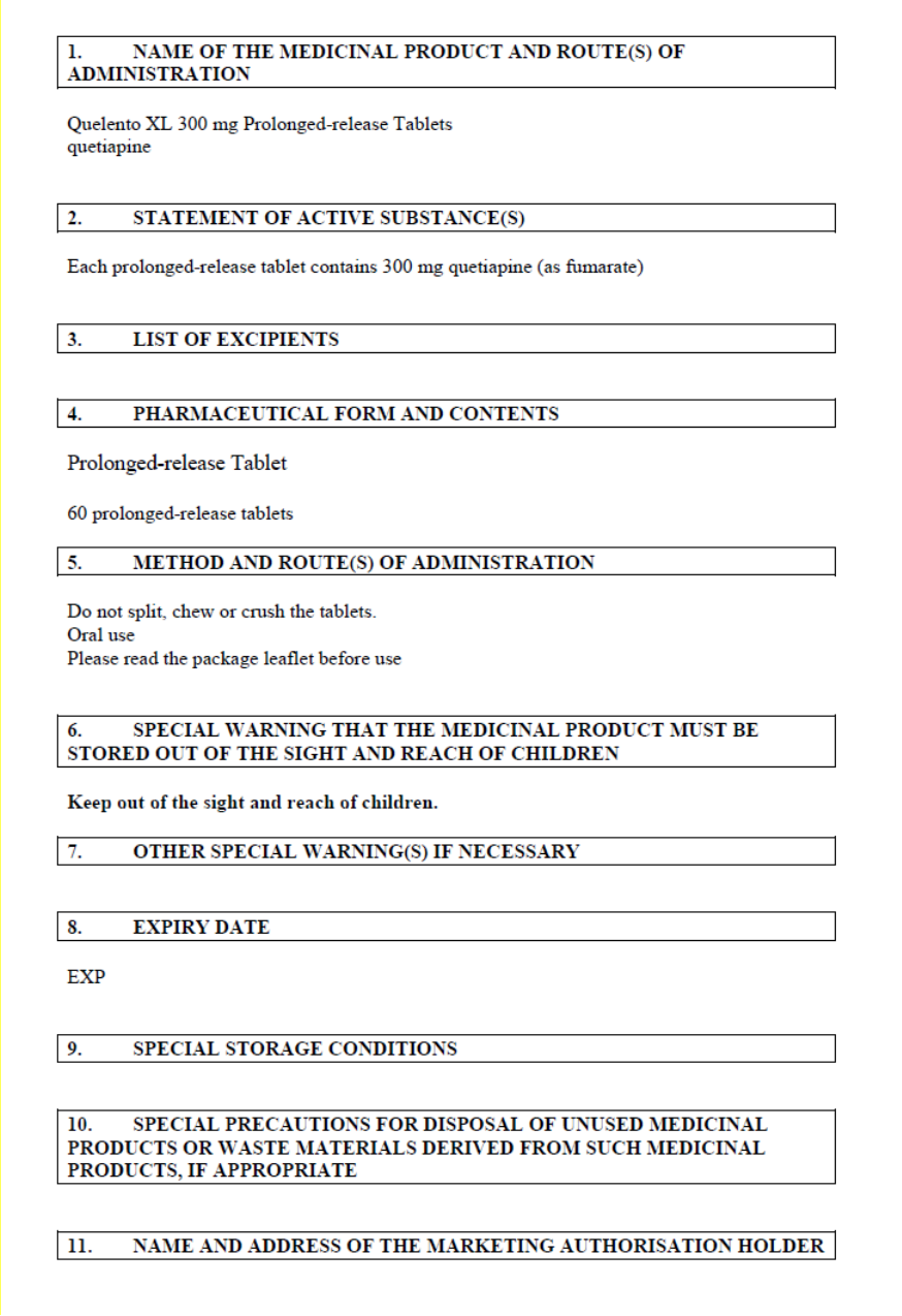 The current approved UK labelling Quelento/Sarparm XL 50, 200, 300 and 400 mg