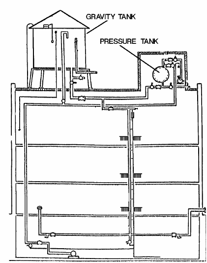 Both a gravity tank and a pressure tank may be used to make sure that an adequate water supply is available.
