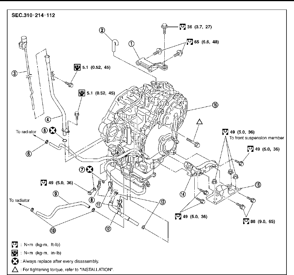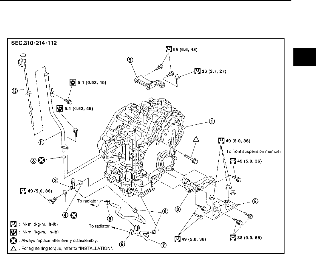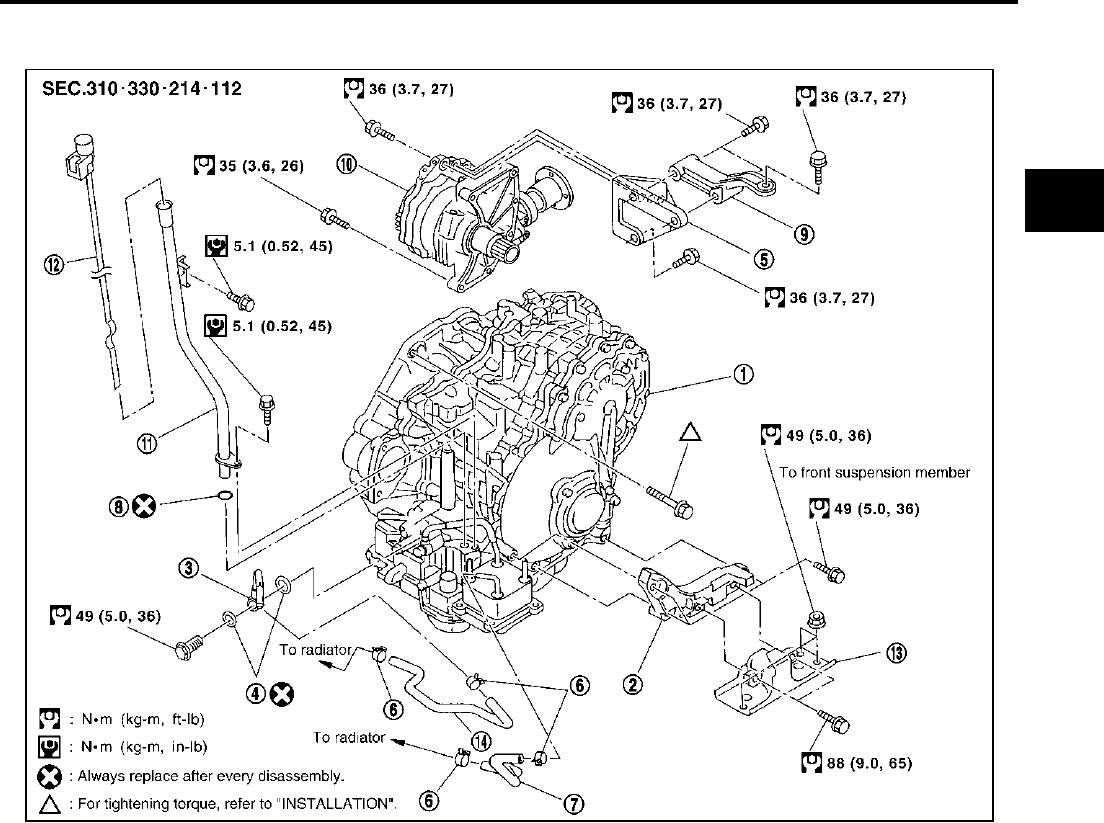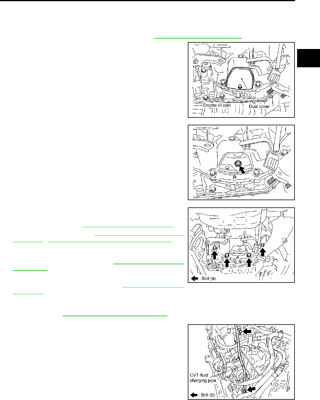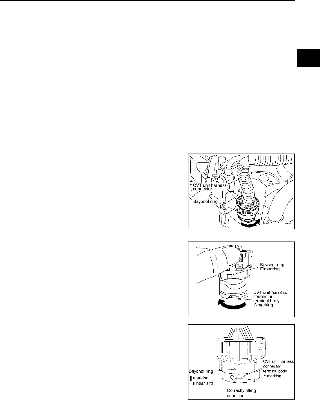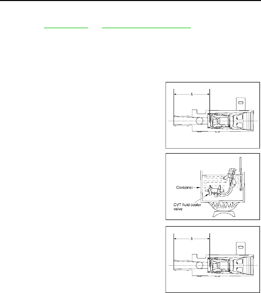 ●After completing installation, check for fluid leakage, fluid level, and the positions of CVT. Refer to CVT-14,