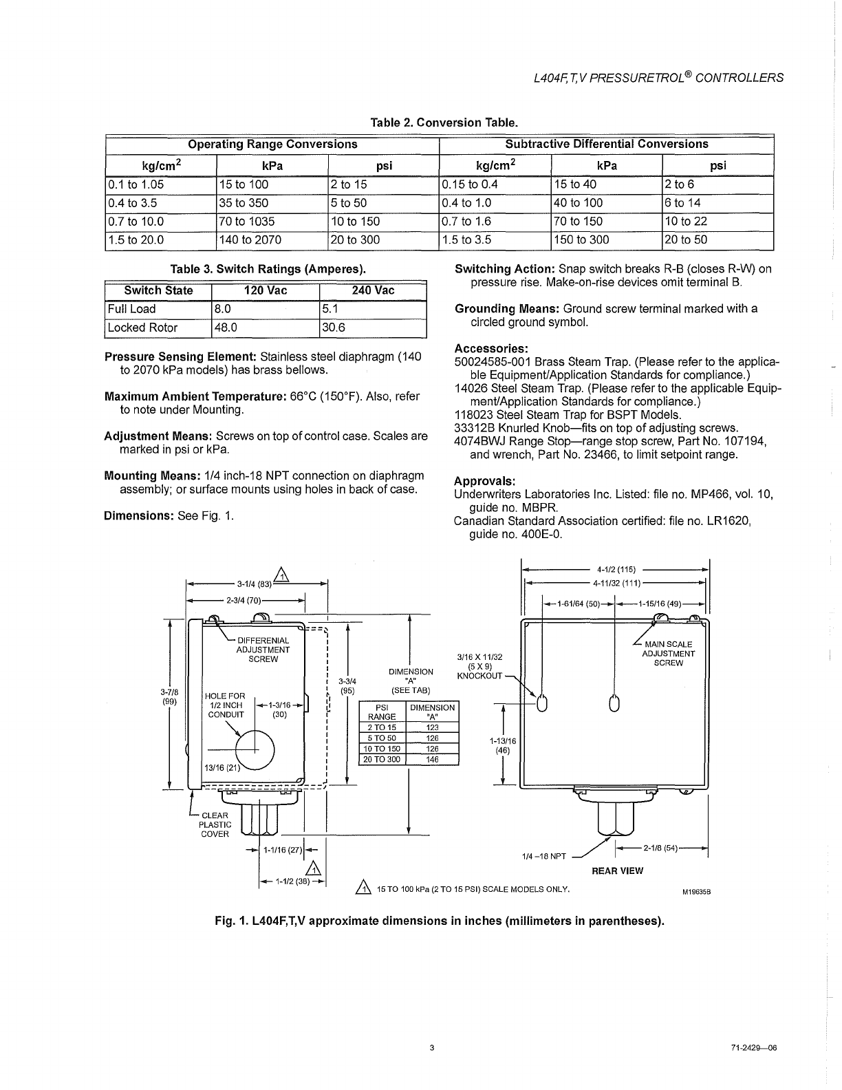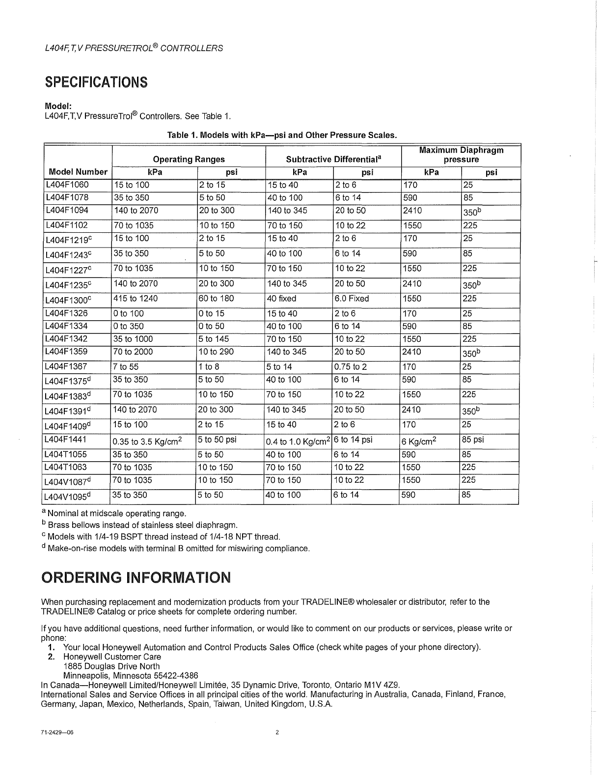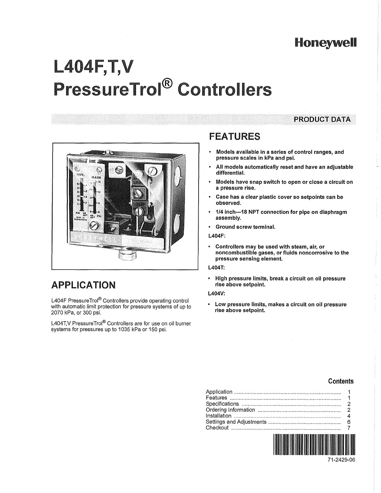 Honeywell Form 71-2429-2 L404 Pressuretrol Controllers