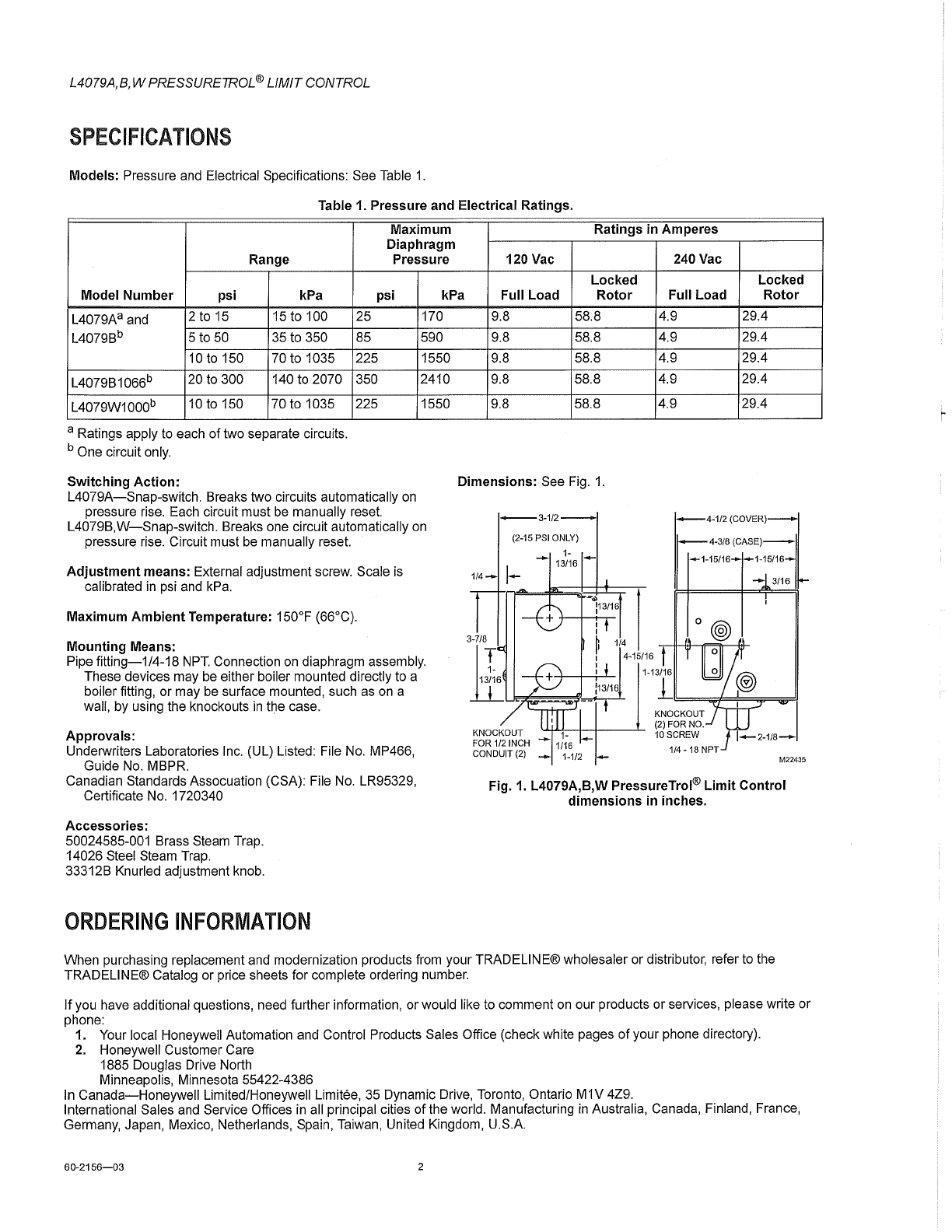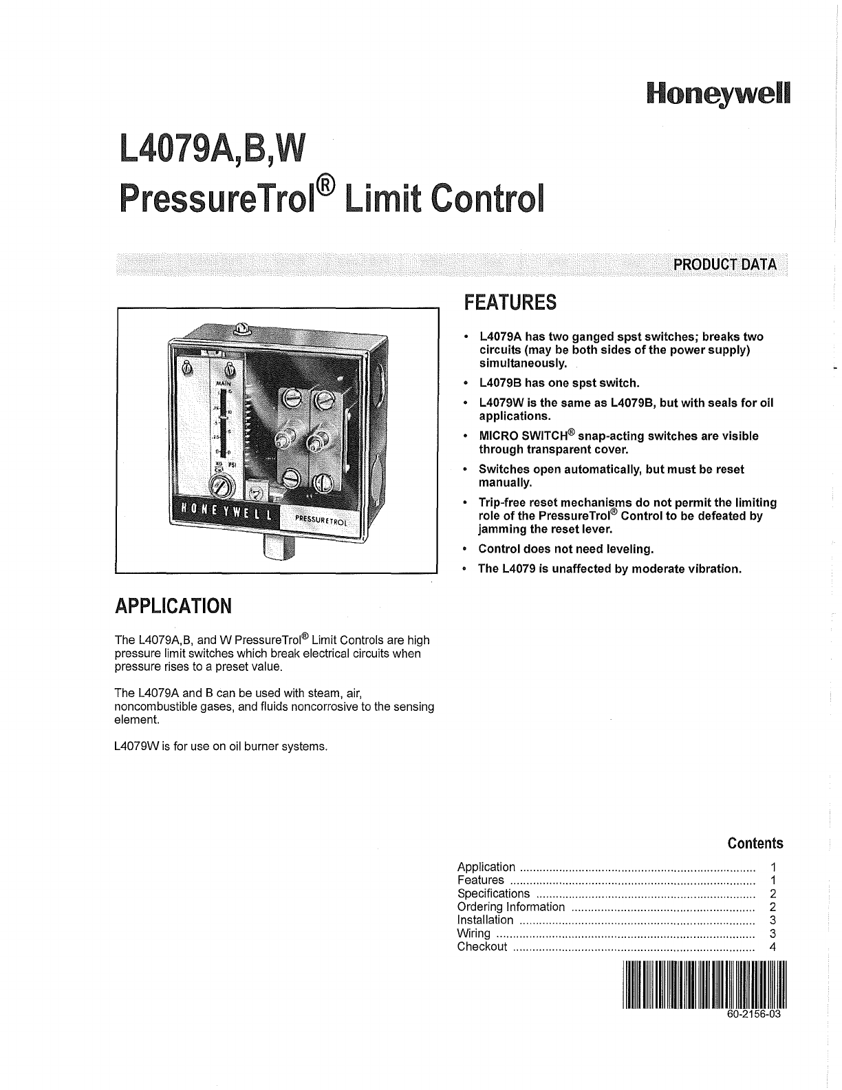 Honeywell Form 60-2156-1 L4079 Pressuretrol Limit Control