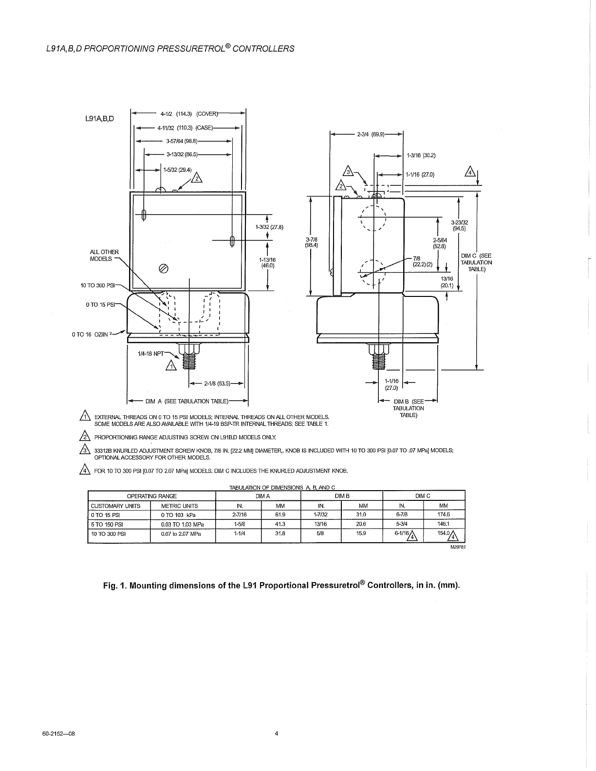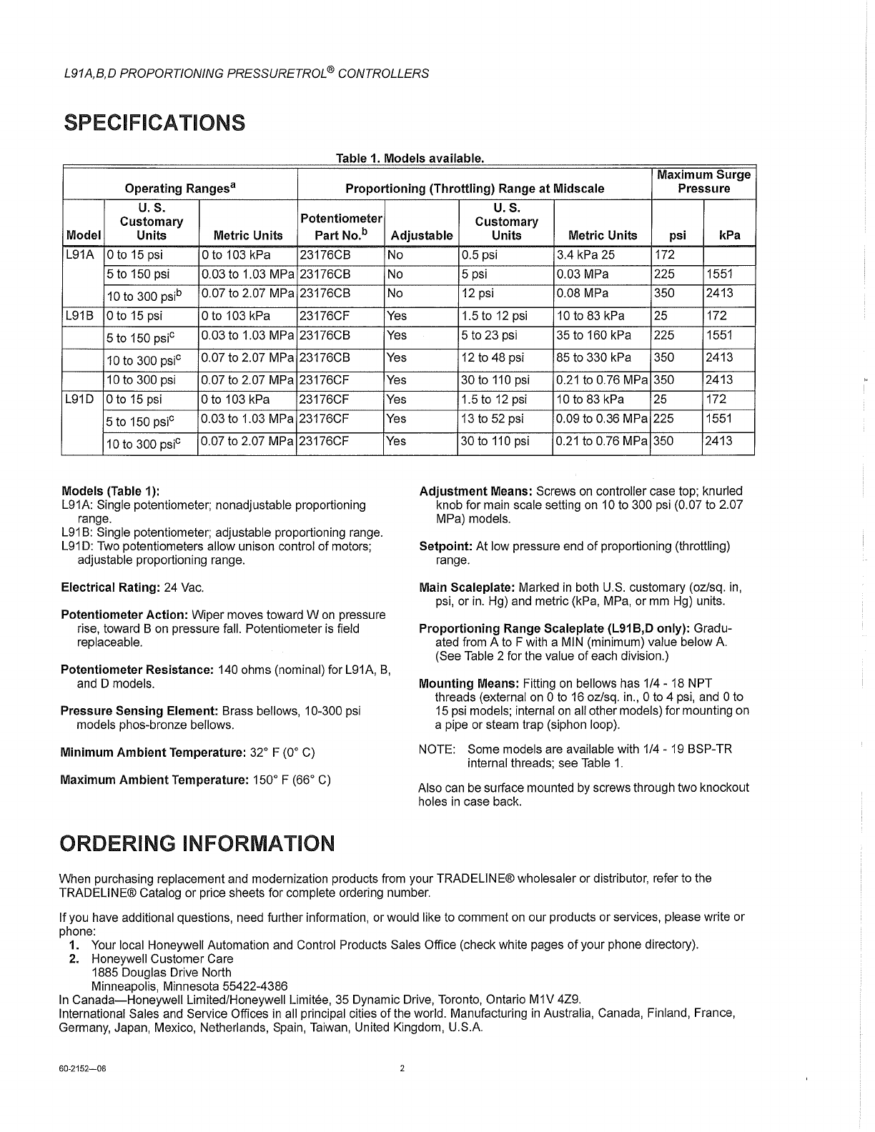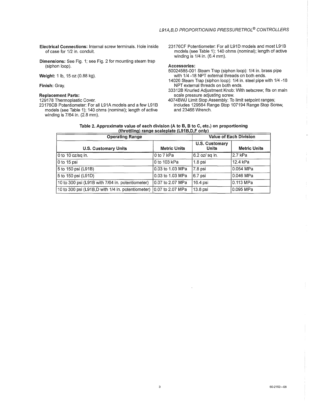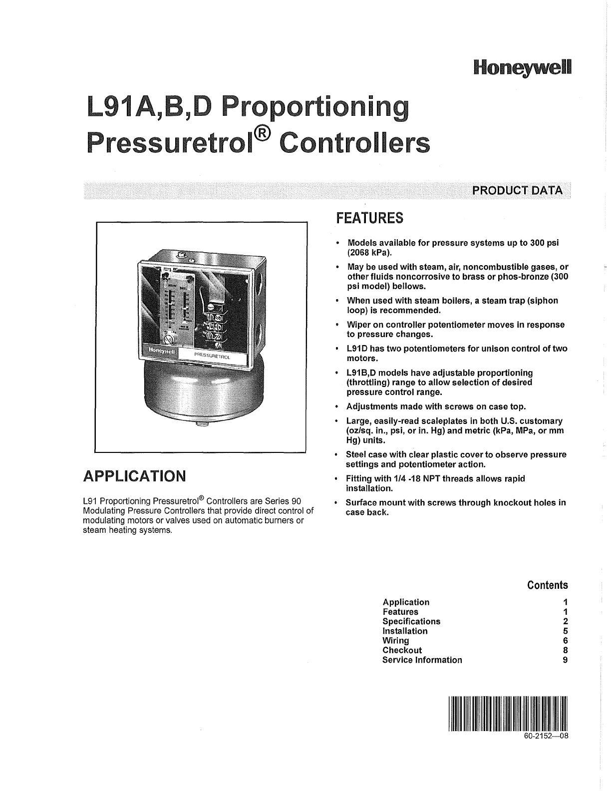 Honeywell Form 60-2152-5 L91 Pressuretrol Controllers
