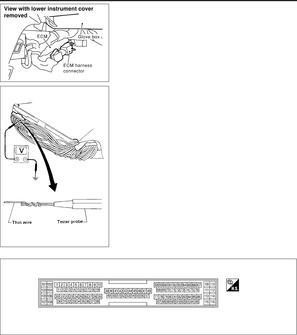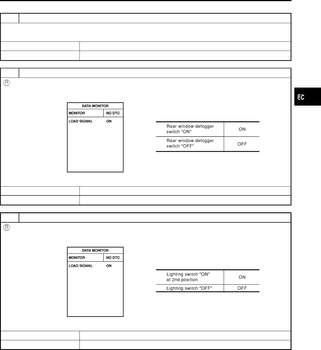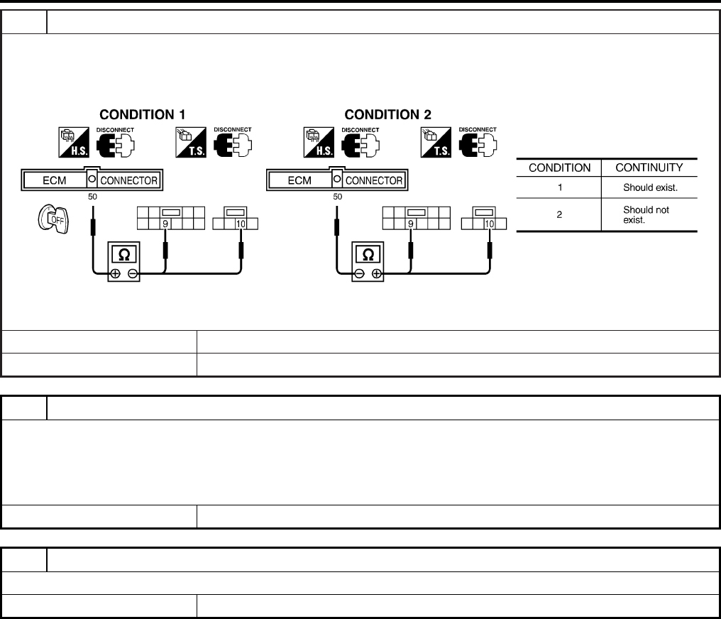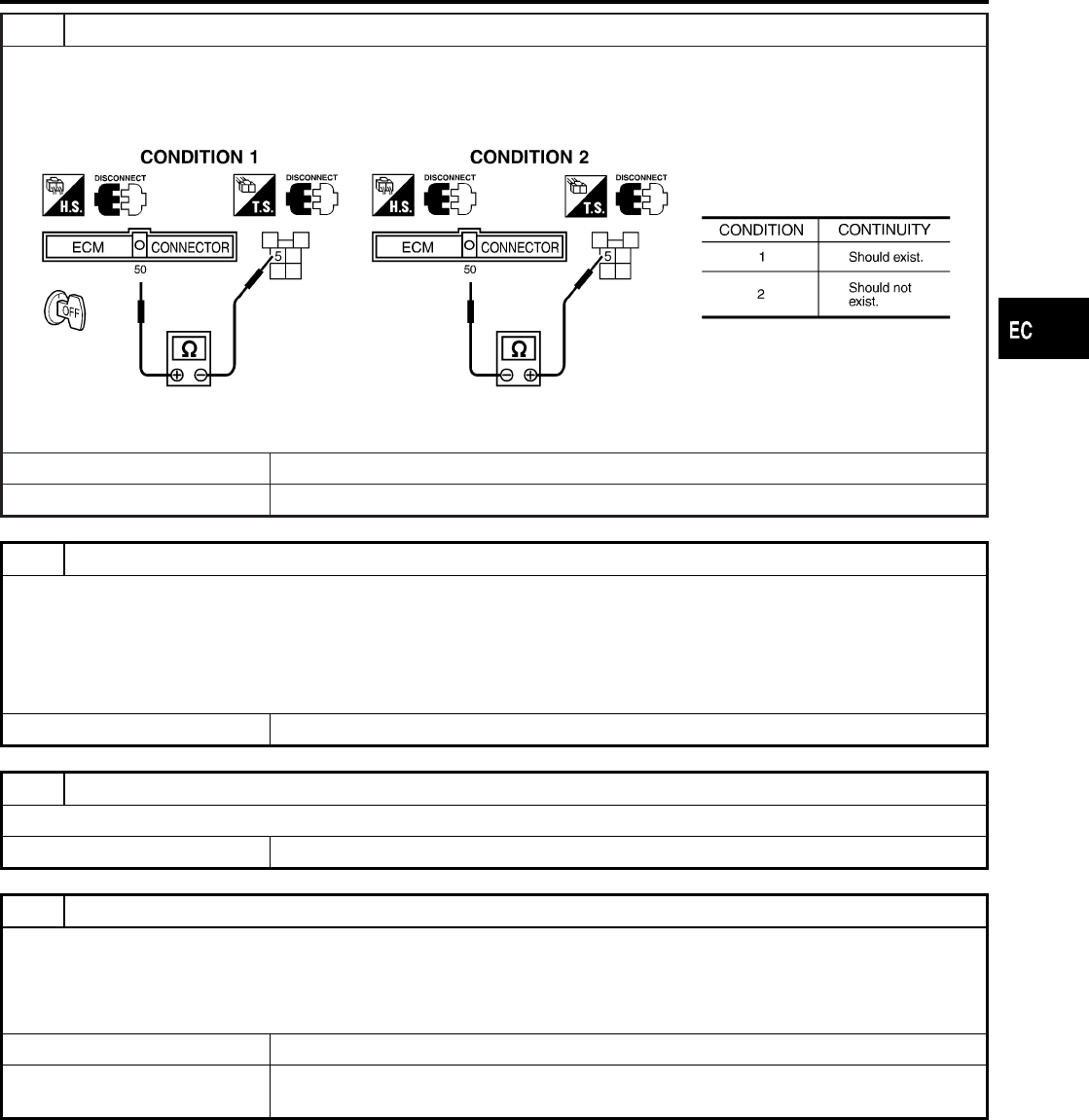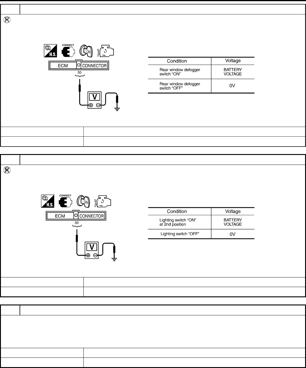 4. Check harness continuity between ECM terminal 50 and lighting switch terminals 9, 10 under the following conditions.