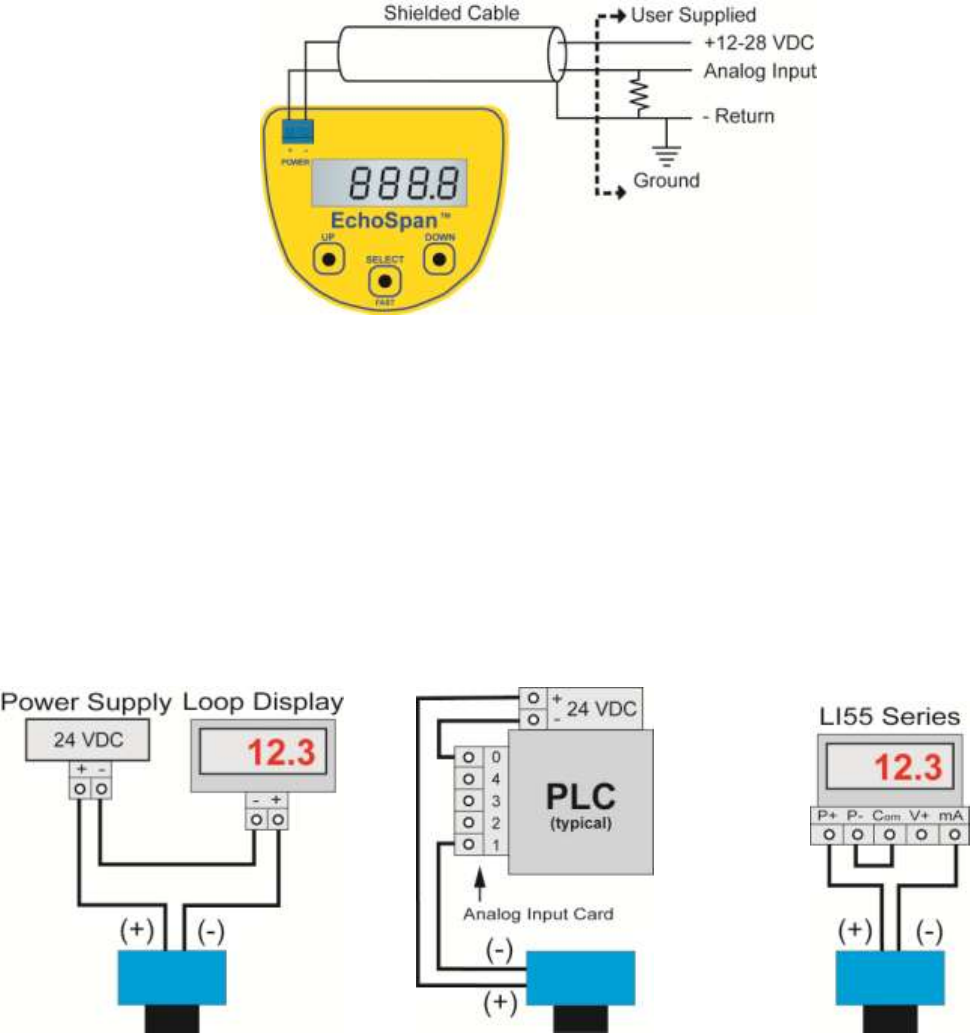 The following wiring diagram can be used for the 4-20 mA output of the EchoSpan®.