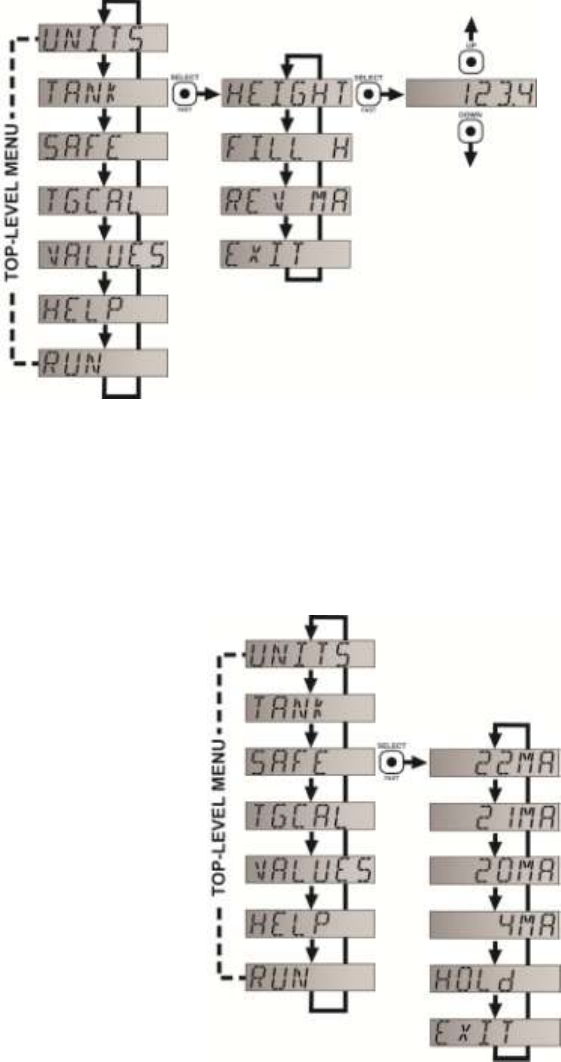 scroll through the following (UNITS – TANK – SAFE – TGCAL – VALUES –