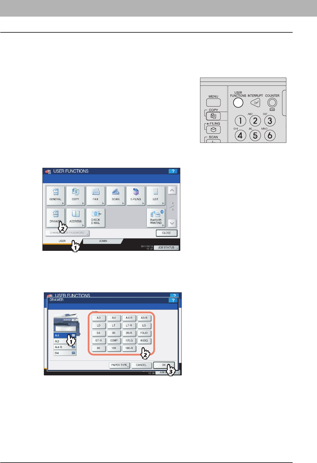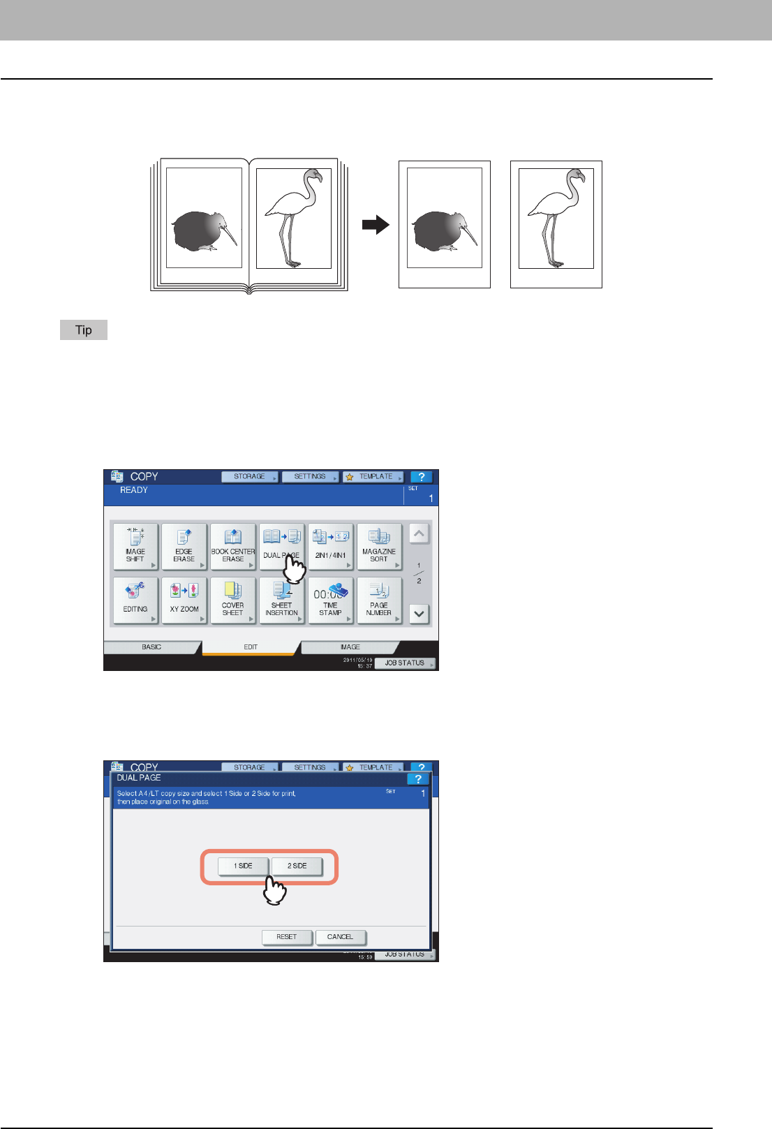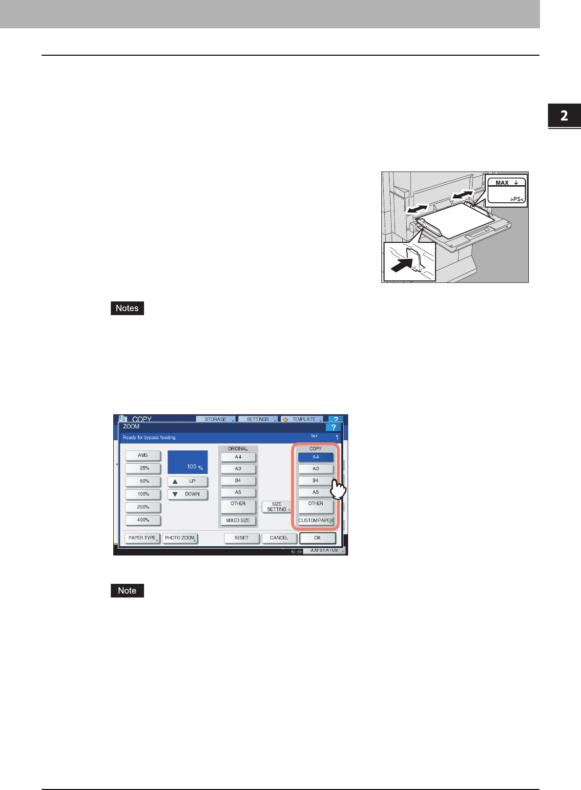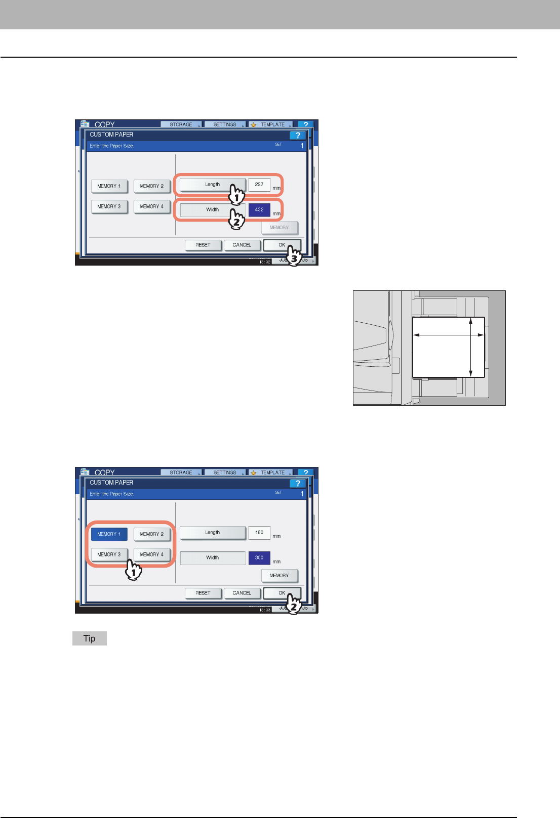 Paper or originals of A4, B5 or LT size can be placed either in a portrait direction or in a landscape direction. In this