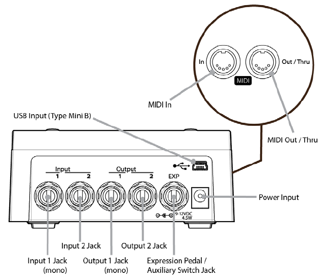 - [OUTPUT] – MIDI Transmit/Thru Select (XMT, THRU, THRU+C, MERGE)
