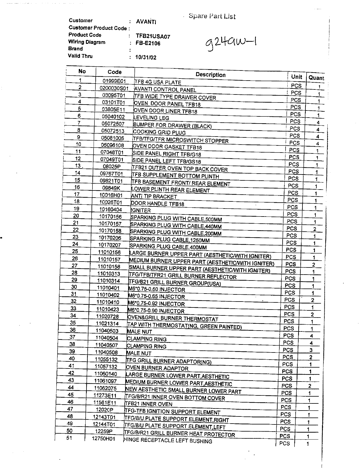 G24AW-1 Parts List