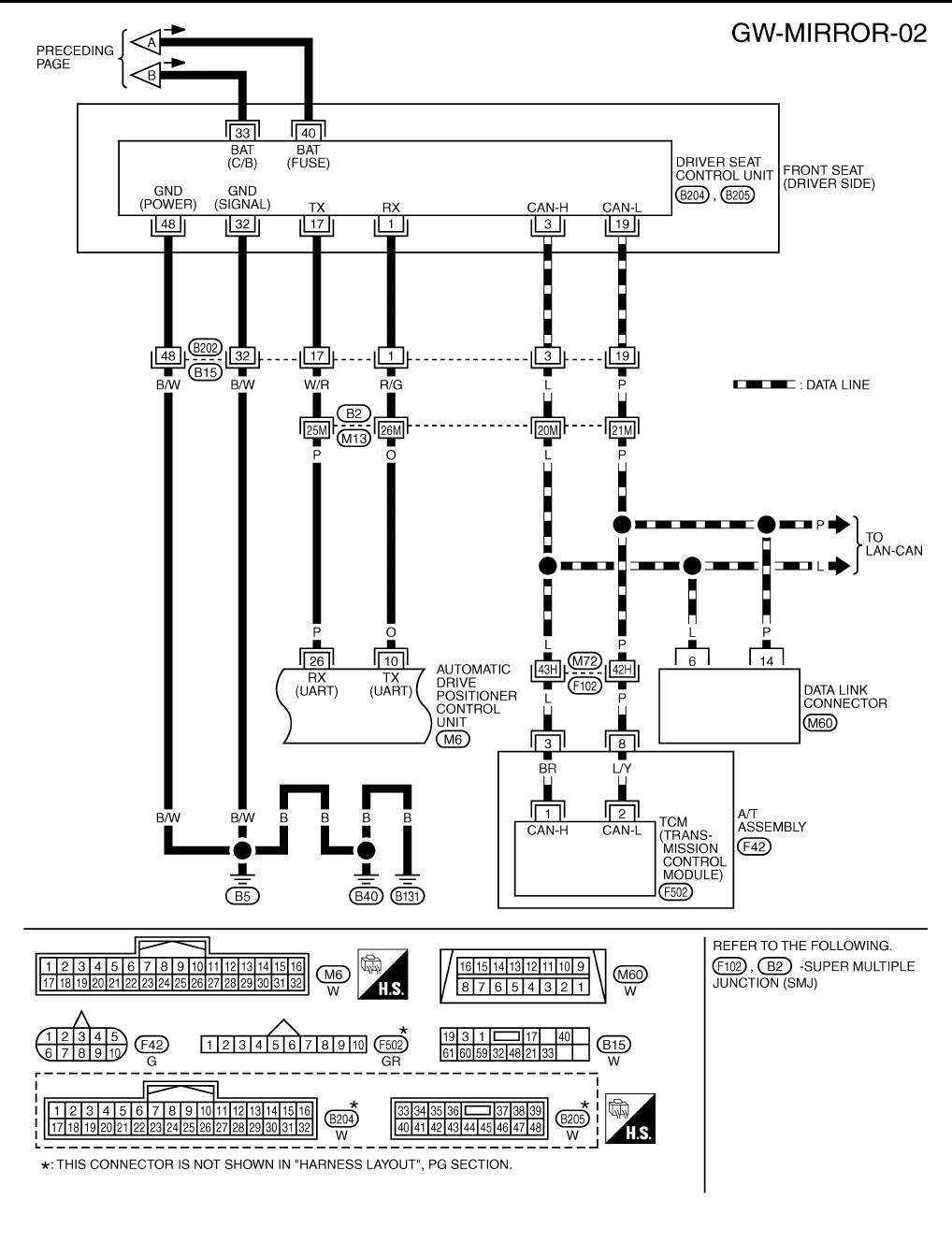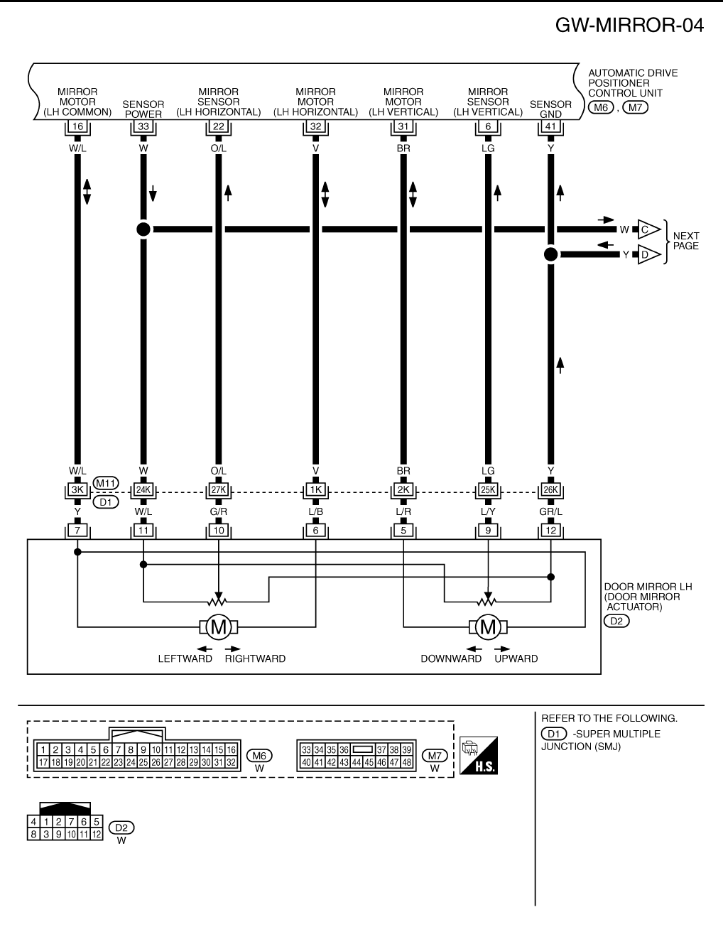 NG >> Repair or replace harness between automatic drive positioner control unit and door mirror.