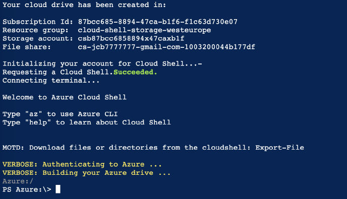 Para ellos desde la página de azure activamos el uso de power shell en la barra