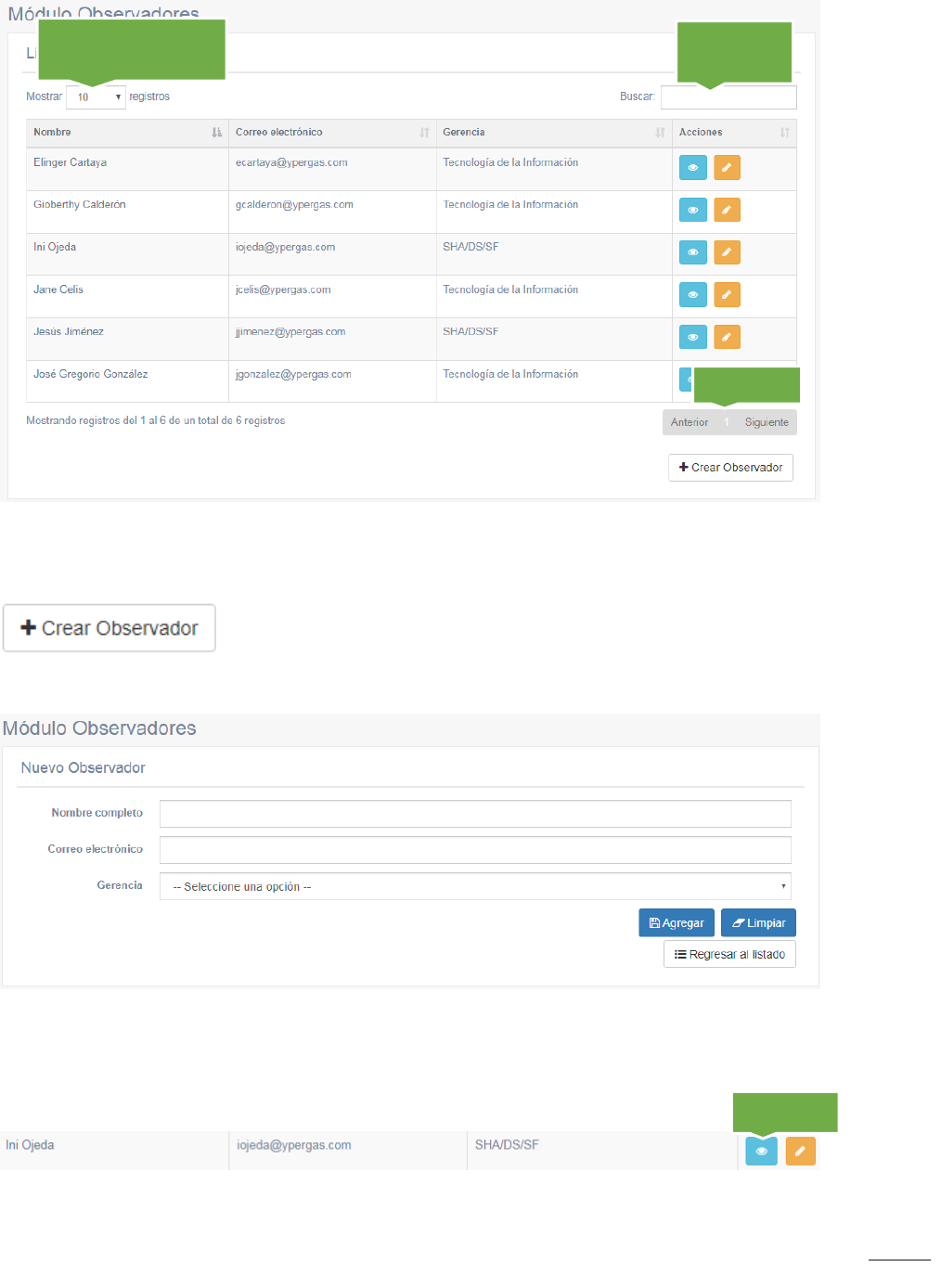 La pantalla de inicio del módulo presenta una tabla con los observadores registrados. Además, tiene