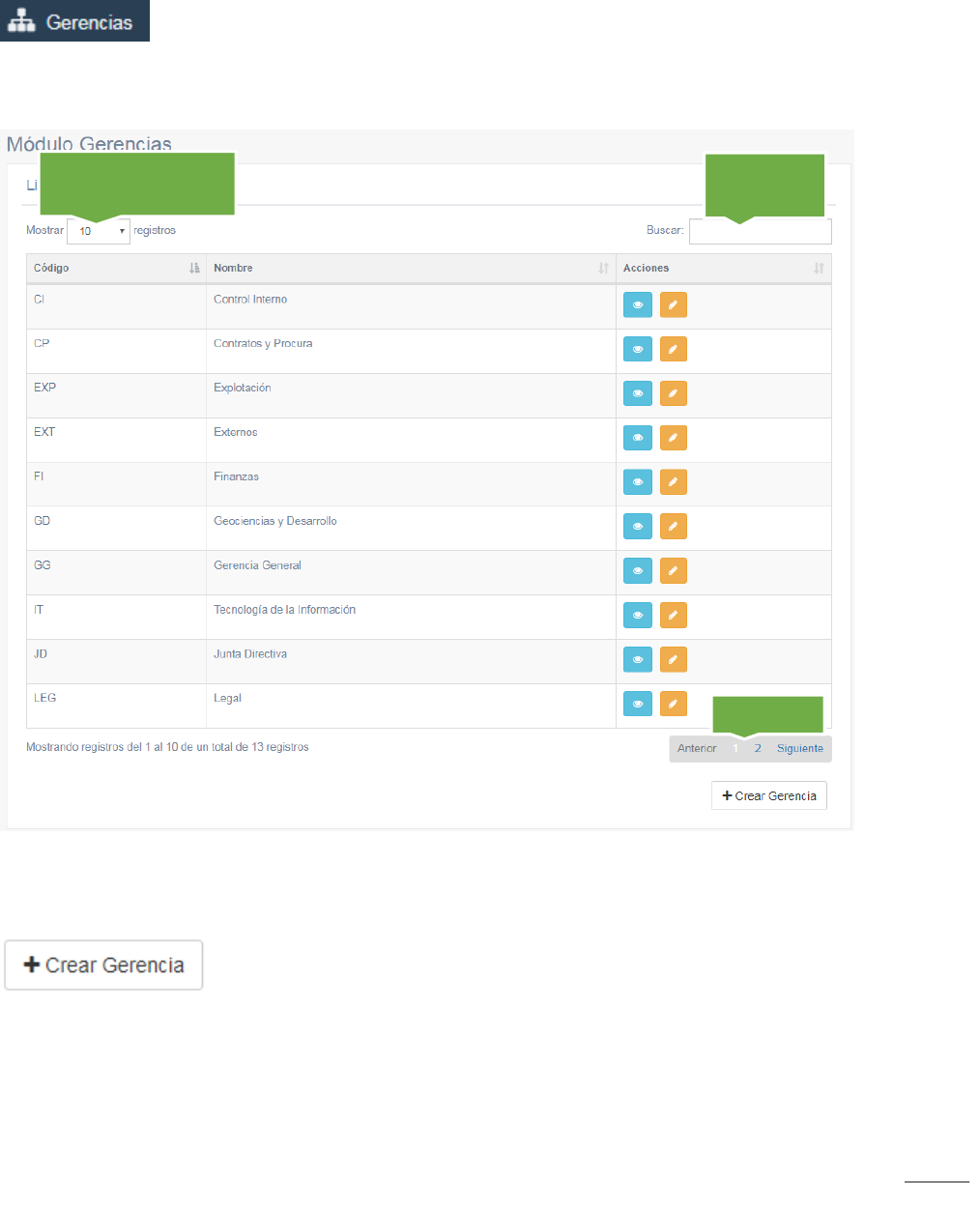 La pantalla de inicio del módulo presenta una tabla con las gerencias registradas. Además, tiene