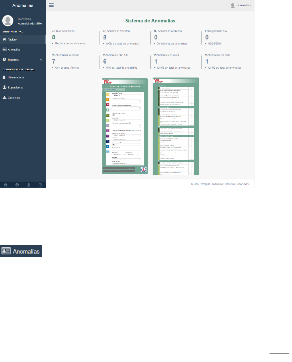 Es la sección de inicio del sistema y presenta indicadores sobre las anomalías registradas.