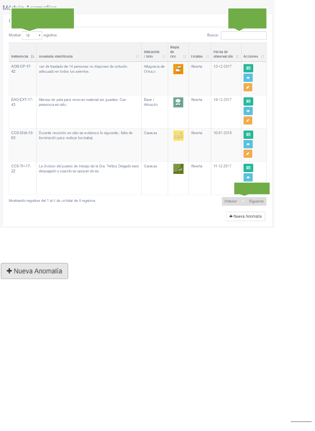 La pantalla de inicio del módulo presenta una tabla con las anomalías registradas. Además, tiene