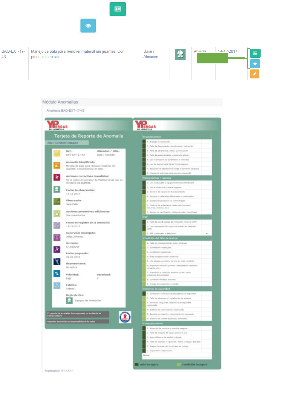 Con la primera opción se mostrará el detalle de la anomalía bajo el formato de la tarjeta: