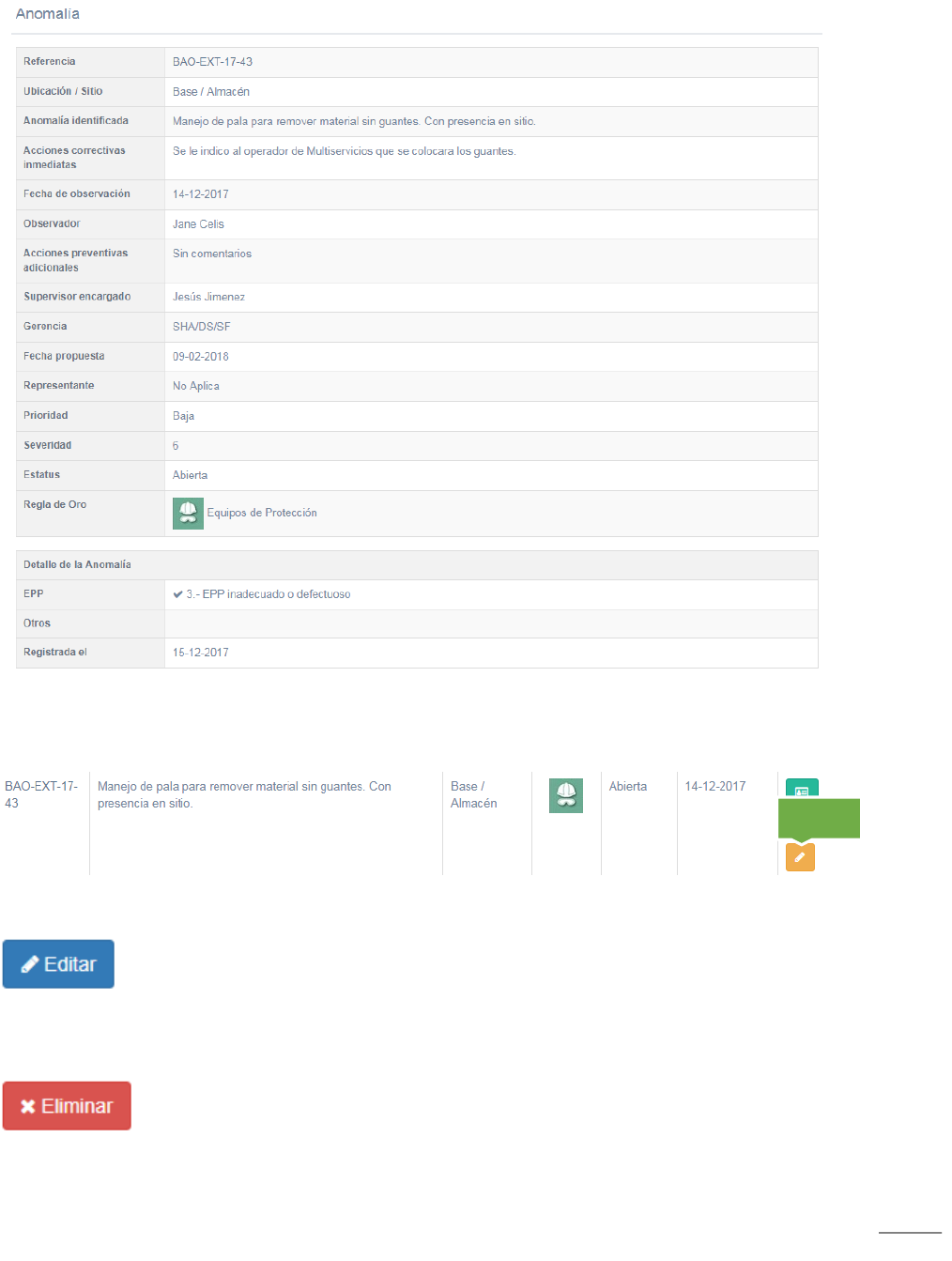 Para editar la información de a anomalía debe presionar el icono Editar del registro.