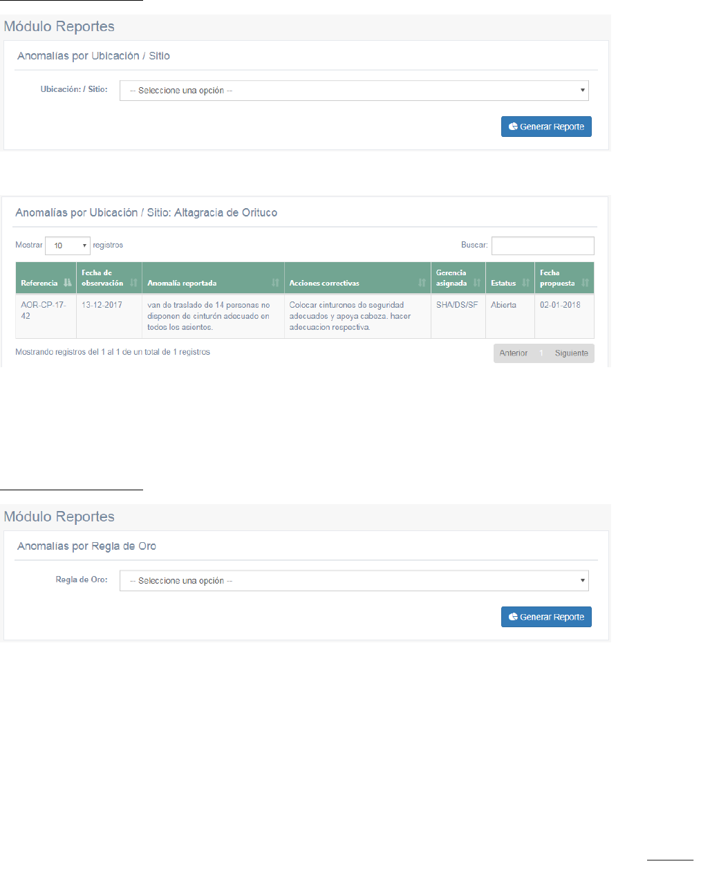 Reporte que genera el listado de anomalías registradas para la regla de oro seleccionada.