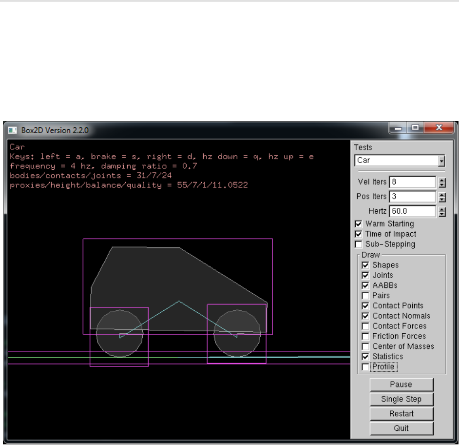 encouraged to look at the testbed included with Box2D to learn more. Also, the Box2D code base has