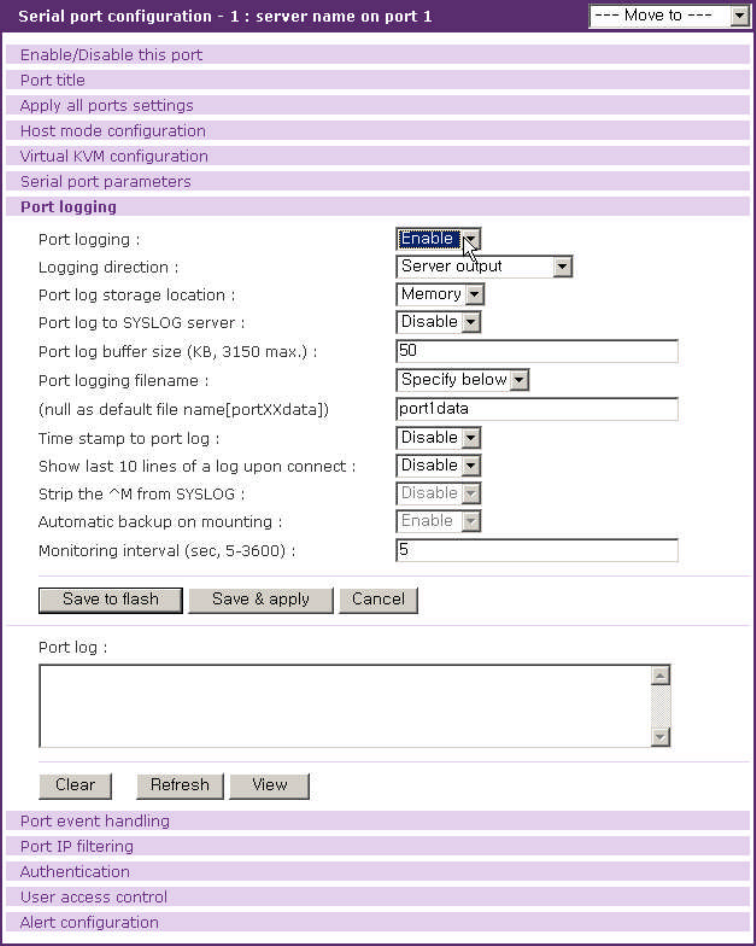 button and view the port logs with the View logs button. When a program other than the KVM client