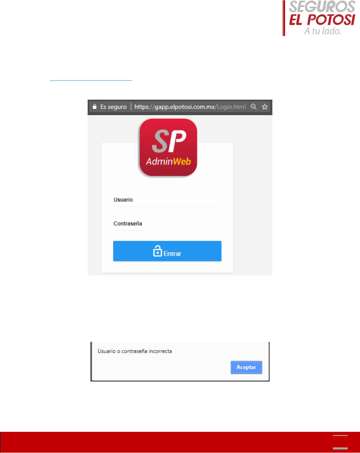 Si alguno de los datos introducidos es incorrecto, el sistema nos arroja el siguiente mensaje: