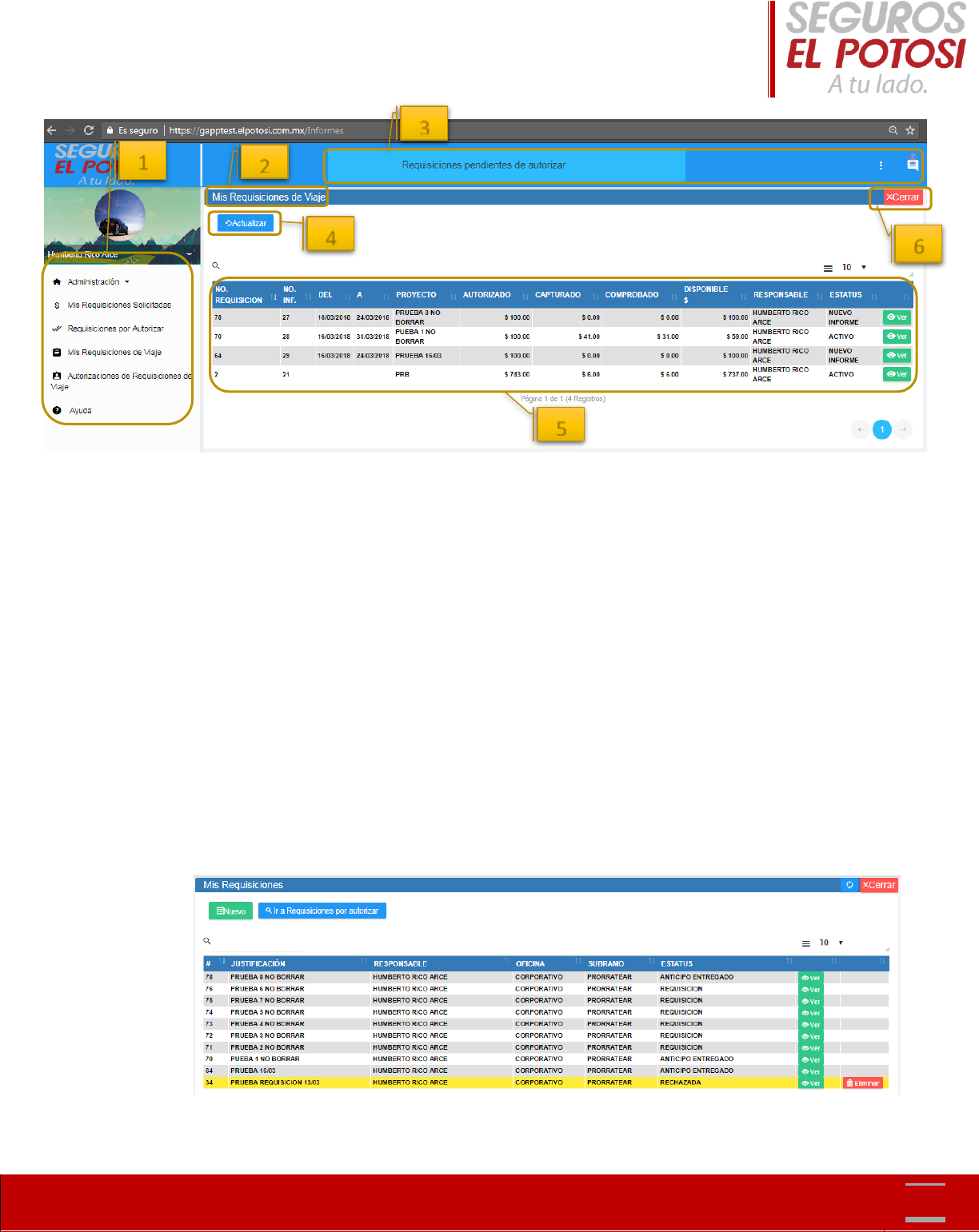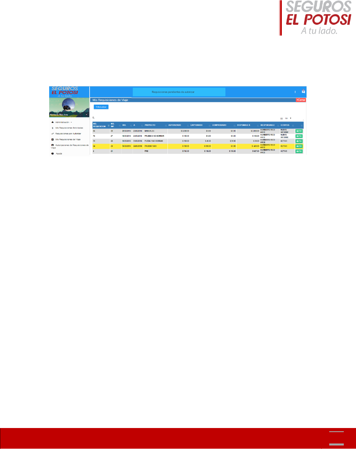 5. Listado de requisiciones de viaje generadas por el usuario.