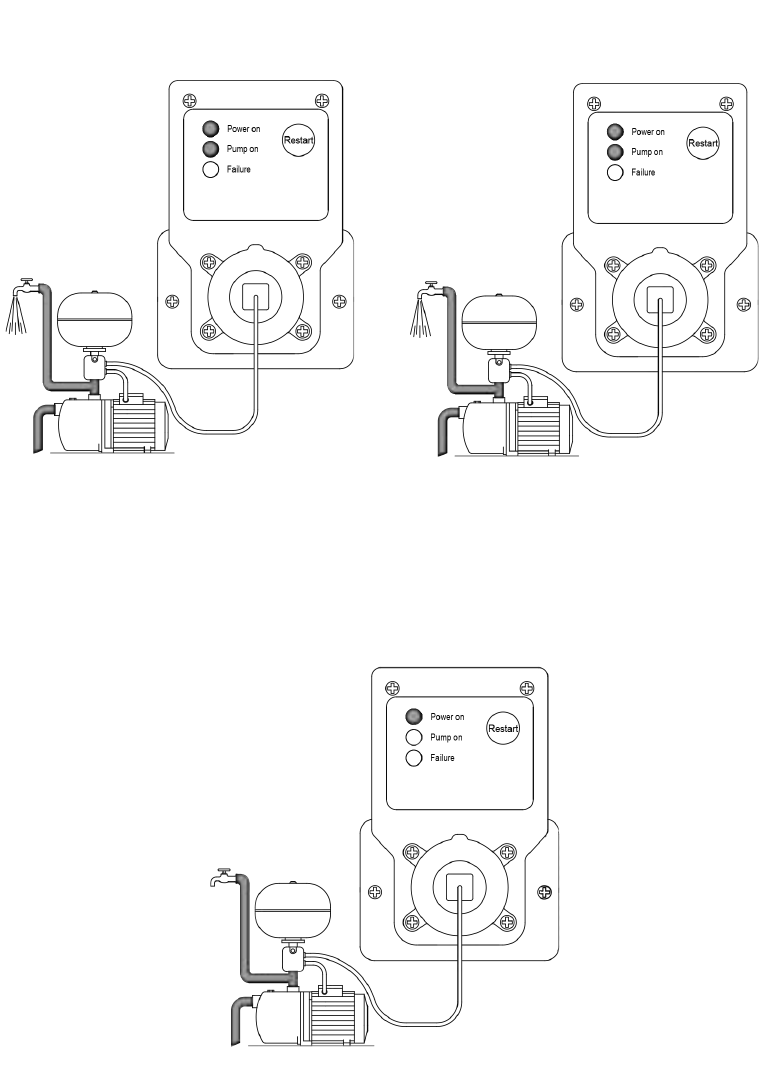 svetiel: zelené Power on, žlté Pump on, červené Failure.