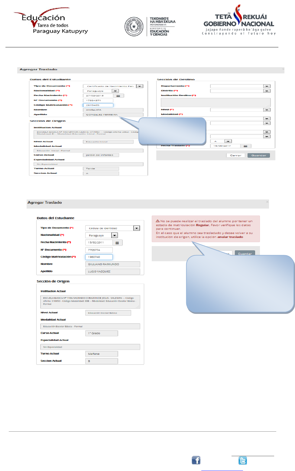 matriculación en sus nuevas instituciones en el periodo actual. Ej.: Colegios
