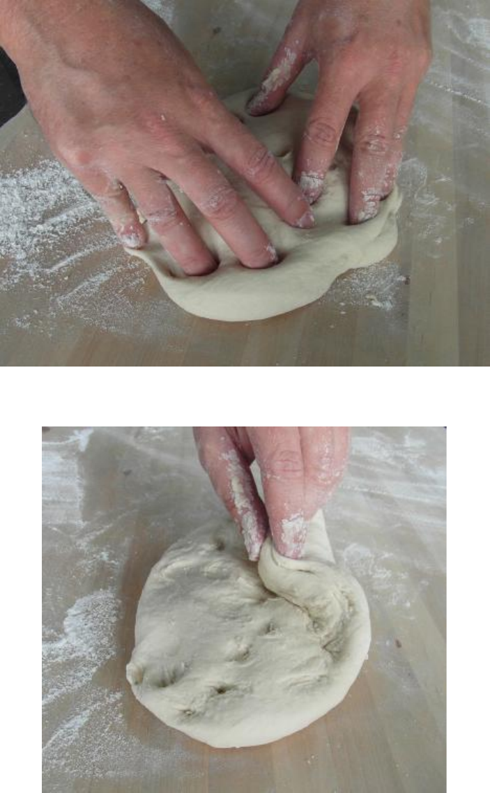 With your dough smooth side down, prod it fairly flat with your fingertips until it is as wide as