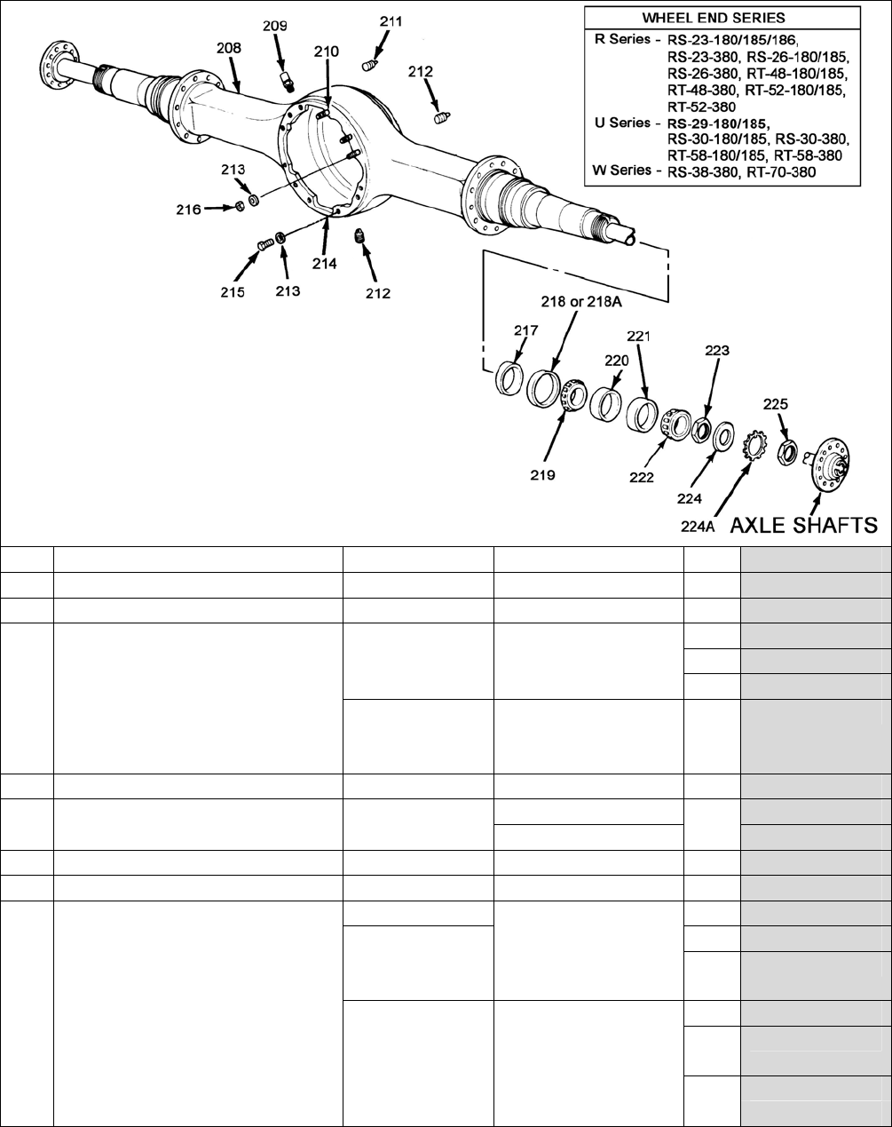 This chart covers the housing assemblies and wheel end parts for all axles. The parts are listed according to