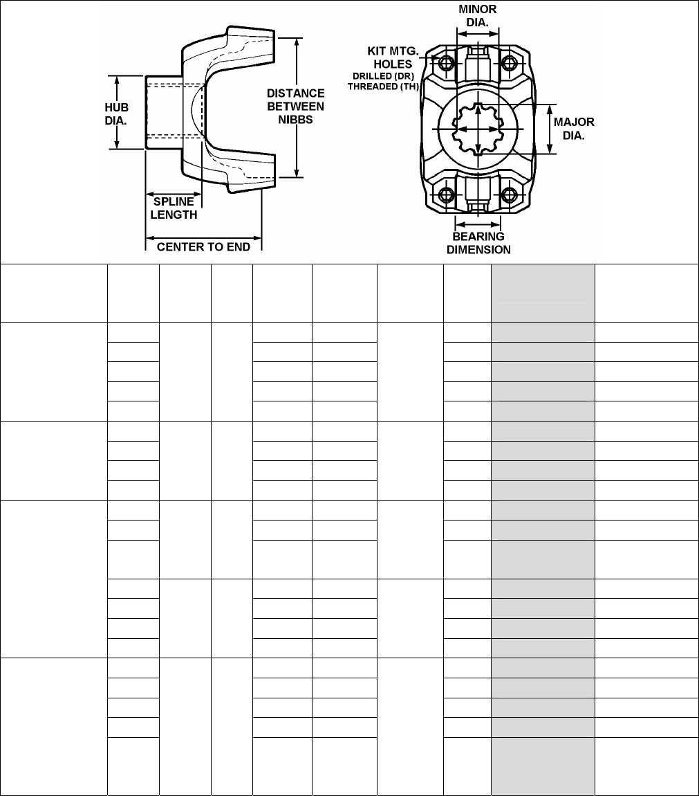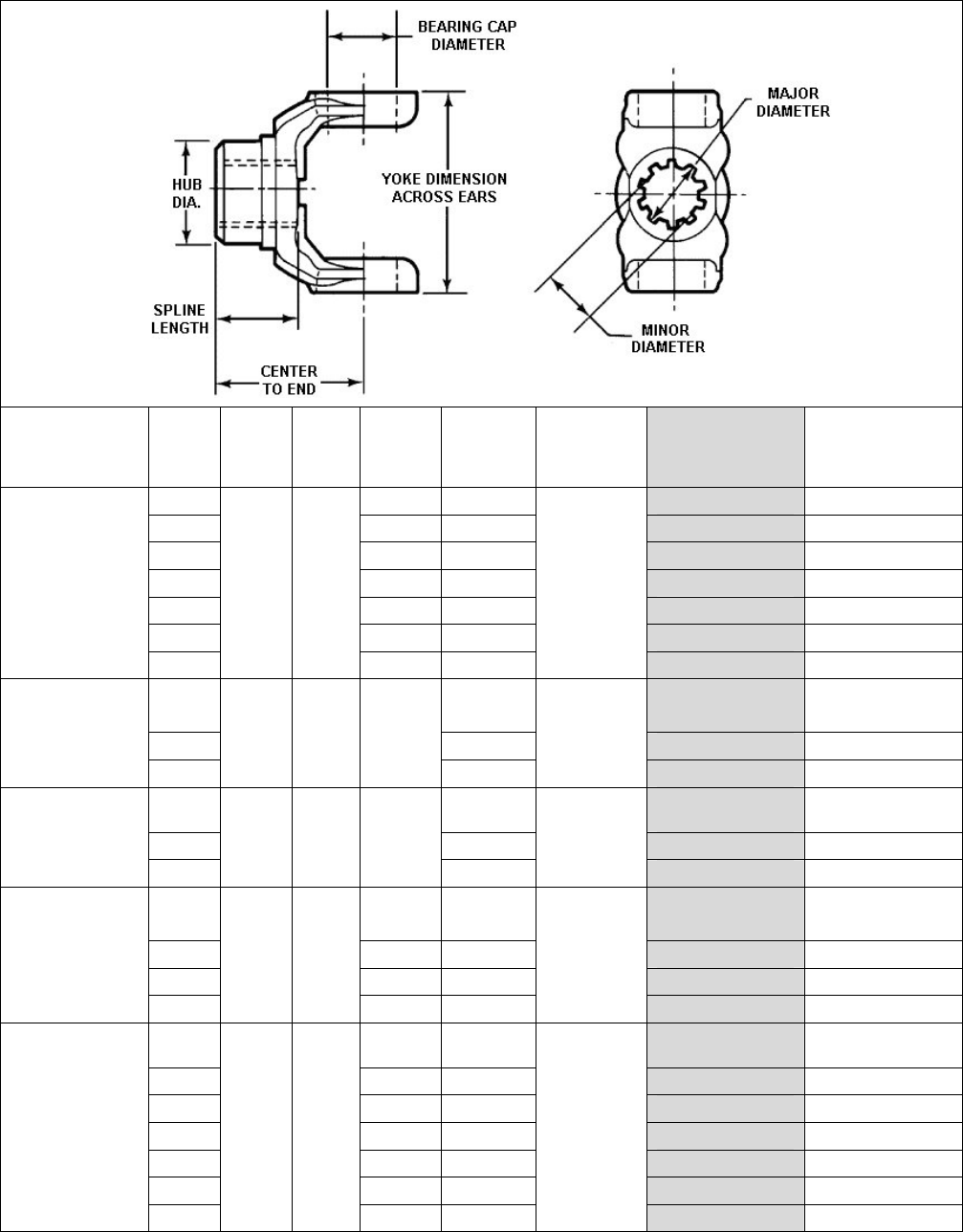 There are four charts that cover full round bearing yokes, wing bearing yokes, Easy Service yokes and flanges.