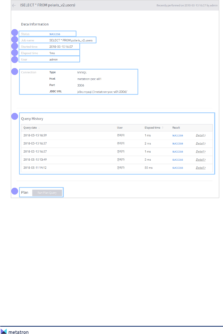 ❽ Data History: The data history output by executing a query. A user can copy the output